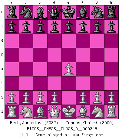 Last move : 1-0 2021 September 17 4:28:3 [Event "FICGS__CHESS__CLASS_A__000249"] [Site "FICGS"] [Date "2021.08.06"] [Round "1"] [White "Pech,Jaroslav"] [Black "Zahran,Khaled"] [Result "1-0"] [WhiteElo "2082"] [BlackElo "2000"] 1.e4 1-0 This chess game has been lost on time (started : 2021.08.06 2:46:33) King's pawn Opening Player White won this chess game. Follow this game move after move (download)Dazzling combinations are for the many, shifting wood is for the few. (Georg Kieninger) Wer nie einen Fehler gemacht hat, hat nie etwas Neues ausprobiert. (Albert Einstein) El Ajedrez es un juego de pelea el cual es puramente intelectual e incluye la suerte. (Richard Reti) Le plus grand jeu de l'esprit jamais inventé, plus vous l'apprenez, plus vous y prenez du plaisir. (Garry Kasparov) Games, world of games... There's always an opponent, and there's always a victim. (Revolver, movie)