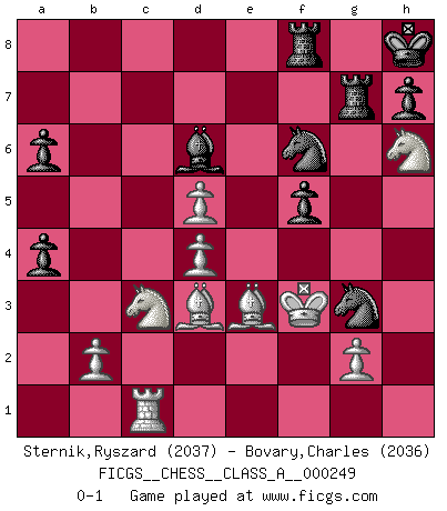 Last move : 0-1 2021 September 14 19:5:33 [Event "FICGS__CHESS__CLASS_A__000249"] [Site "FICGS"] [Date "2021.08.06"] [Round "1"] [White "Sternik,Ryszard"] [Black "Bovary,Charles"] [Result "0-1"] [WhiteElo "2037"] [BlackElo "2036"] 1.e4 e5 2.f4 exf4 3.Nf3 g5 4.h4 g4 5.Ne5 Nf6 6.Bc4 d5 7.exd5 Bd6 8.d4 Nh5 9.O-O O-O 10.Rxf4 Qxh4 11.Qxg4+ Bxg4 12.Rxg4+ Qxg4 13.Nxg4 Kh8 14.Nc3 Nd7 15.Bb5 Rad8 16.Nh6 Ndf6 17.Bd3 Rde8 18.Kf2 Ng3 19.Kf3 Nfh5 20.Ng4 Rg8 21.Nh6 Rg7 22.Nb5 f5 23.c4 Bf8 24.c5 a6 25.Nc3 Be7 26.Bc4 Rf8 27.Be3 b5 28.cxb6 cxb6 29.Re1 b5 30.Bd3 Bd6 31.a4 bxa4 32.Rc1 Nf6 0-1 KGA : Kieseritsky, Berlin defense, 6.Bc4 Kingside Castling by player White (move 9) Kingside Castling by player Black (move 9) Player Black won this chess game. Follow this game move after move (download)The beauty of a move lies not in its' appearance but in the thought behind it. (Siegbert Tarrasch) Rauchen ist dem Schachspieler bei seiner Arbeit, also im Wettkampf, untersagt. (Viktor Kortschnoi) No todos los artistas son jugadores de Ajedrez, pero todos los jugadores de Ajedrez son artistas. (Marcel Duchamp) Dieu déplace le joueur, et celui-ci la pièce. Quel Dieu derrière Dieu commence donc la trame ? Arturo Perez-Reverte (prix de littérature policière 1993). Life doesn't imitate art, it imitates bad television. (Woody Allen)