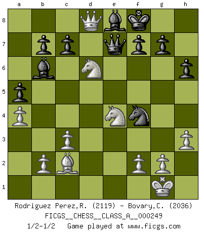 Last move : 1/2-1/2 2021 October 15 23:21:39 [Event "FICGS__CHESS__CLASS_A__000249"] [Site "FICGS"] [Date "2021.08.06"] [Round "1"] [White "Rodriguez Perez,Rene"] [Black "Bovary,Charles"] [Result "1/2-1/2"] [WhiteElo "2119"] [BlackElo "2036"] 1.e4 e5 2.Nf3 Nc6 3.Bc4 Nf6 4.d3 Bc5 5.c3 d6 6.O-O O-O 7.Nbd2 a5 8.Re1 h6 9.Nf1 Be6 10.Bb5 Ne7 11.Ba4 Ng6 12.Ng3 Bb6 13.h3 d5 14.exd5 Nxd5 15.Bc2 Re8 16.d4 exd4 17.Nxd4 Bd7 18.Ndf5 Rxe1+ 19.Qxe1 Qf8 20.Bd2 Qc5 21.a4 Re8 22.Qf1 Ndf4 23.Re1 Rxe1 24.Qxe1 Bc6 25.Bxf4 Nxf4 26.Qd2 Qe5 27.Qd8+ Be8 28.Ne4 Kf8 29.Nfd6 Qe7 1/2-1/2 Two knights defense (Modern Bishop's Opening) Kingside Castling by player White (move 6) Kingside Castling by player Black (move 6) This chess game ended in a draw. Follow this game move after move (download)I like to say that Bobby Fischer was the greatest player ever. But what made Fischer a genius was his ability to blend an American freshness and pragmatism with Russian ideas about strategy. (Bruce Pandolfini) Vom Schach wurde gesagt das Leben sei dafür nicht lange genug. Aber das ist der Fehler des Lebens, nicht des Schach'. (Irving Chernev) Botvinnik trataba de restarle el misterio al Ajedrez, siempre relacionandolo a situaciones de la vida ordinaria. El gustaba de llamar al Ajedrez un típico problema inexacto similar a aquellos de los cuales la gente siempre tiene que enfrentarse en la vida cotidiana. (Garry Kasparov) La solitude du joueur d'Echecs à l'approche du mat est semblable à celle du condamné. (Francis Szpiner) Life is pain my dear and anyone who says otherwise is selling something. (Princess Bride)