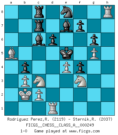 Last move : 1-0 2021 November 1 18:17:46 [Event "FICGS__CHESS__CLASS_A__000249"] [Site "FICGS"] [Date "2021.08.06"] [Round "1"] [White "Rodriguez Perez,Rene"] [Black "Sternik,Ryszard"] [Result "1-0"] [WhiteElo "2119"] [BlackElo "2037"] 1.e4 c5 2.Nf3 d6 3.d4 cxd4 4.Qxd4 Nc6 5.Bb5 Qa5+ 6.Nc3 Qxb5 7.Nxb5 Nxd4 8.Nfxd4 Kd8 9.Be3 Bd7 10.Nc3 Nf6 11.f3 Rc8 12.g4 e5 13.Nde2 a6 14.O-O-O h6 15.h4 Bc6 16.Bb6+ Kd7 17.a4 Ke6 18.b3 Be7 19.Ba5 g6 20.Kb2 b5 21.axb5 axb5 22.Bb4 Rhd8 23.Rh2 Rd7 24.Ng3 Ra7 25.g5 hxg5 26.hxg5 Ne8 27.f4 exf4 28.Nge2 Ke5 29.Nd4 Rac7 30.Nf3+ Ke6 31.Rh7 Bf8 32.Nd4+ Ke5 33.Rh8 Be7 34.Ba5 b4 35.Nf3+ 1-0 Sicilian, Chekhover variation Queenside Castling by player White (move 14) Player White won this chess game. Follow this game move after move (download)He who takes the Queen's Knight's Pawn will sleep in the streets. (Anonymous) Du weisst es gibt ein Problem mit Computern und Fernschach, wenn jeder eine Rating von 2450 hat. (John Christen Knudsen) La única cosa que los jugadores de Ajedrez tienen en común, es el Ajedrez. (Lodewijk Prins) Mais l'homme est une créature légère et illogique : semblable au joueur d'échecs, il n'aime que le processus du but à atteindre, non le but lui-même. (Dostoïevsky) A specialist learns more and more about less and less until he knows everything about nothing. (Nicholas Murray Butler)
