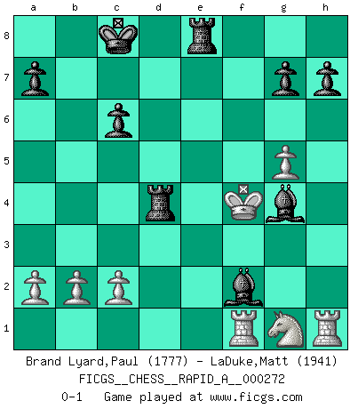 Last move : 0-1 2021 August 23 1:8:40 [Event "FICGS__CHESS__RAPID_A__000272"] [Site "FICGS"] [Date "2021.08.13"] [Round "1"] [White "Brand Lyard,Paul"] [Black "LaDuke,Matt"] [Result "0-1"] [WhiteElo "1777"] [BlackElo "1941"] 1.e4 e5 2.Bc4 Nf6 3.Nc3 Bc5 4.Qf3 c6 5.g4 d5 6.exd5 e4 7.Nxe4 Qe7 8.d3 cxd5 9.Bb5+ Nc6 10.Bxc6+ bxc6 11.Bg5 dxe4 12.dxe4 Qxe4+ 13.Qxe4+ Nxe4 14.h4 Bxf2+ 15.Ke2 Bxg4+ 16.Kd3 f6 17.Kxe4 fxg5 18.hxg5 O-O-O 19.Rf1 Rhe8+ 20.Kf4 Rd4+ 0-1 Bishop's Opening : Berlin defense Queenside Castling by player Black (move 18) Player Black won this chess game. Follow this game move after move (download)Robert Fischer is a law unto himself. (Larry Evans) Je älter ich werde, um so mehr schätze ich die Bauern. (Paul Keres) El poder defensivo de una pieza clavada, solamente es imaginario. (Aaron Nimzovich) Il a essayé de se convaincre qu'il pourrait empêcher toutes les erreurs et ne jamais perdre. L'horreur ! Gary Kasparov au sujet de Robert Fischer. The difference between perseverance and obstinacy is that one comes from a strong will, and the other from a strong won't. (Henry Ward Beecher)