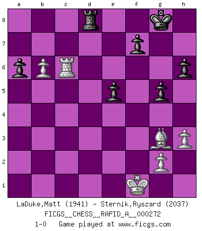 Last move : 1-0 2021 October 13 17:53:10 [Event "FICGS__CHESS__RAPID_A__000272"] [Site "FICGS"] [Date "2021.08.13"] [Round "1"] [White "LaDuke,Matt"] [Black "Sternik,Ryszard"] [Result "1-0"] [WhiteElo "1941"] [BlackElo "2037"] 1.e4 c5 2.Nf3 d6 3.Bb5+ Bd7 4.Bxd7+ Qxd7 5.c4 Nf6 6.Nc3 g6 7.d4 cxd4 8.Qxd4 Nc6 9.Qd3 Bg7 10.O-O Rc8 11.Rb1 O-O 12.b3 Qd8 13.Bd2 Re8 14.Rbc1 Nd7 15.Rfd1 Qa5 16.Qb1 a6 17.h3 Qa3 18.Ne1 Qc5 19.Be3 Qa5 20.Bd2 Qc5 21.Nf3 Nd4 22.Nxd4 Bxd4 23.Be1 Be5 24.a4 e6 25.Ne2 Red8 26.b4 Qc6 27.a5 Bg7 28.f4 Nf6 29.Bh4 Re8 30.Ng3 h6 31.e5 dxe5 32.fxe5 Nh7 33.Ne4 Bxe5 34.b5 Qc7 35.b6 Qc6 36.c5 g5 37.Be1 Rcd8 38.Nd6 Rf8 39.Qe4 Qxe4 40.Nxe4 Nf6 41.Rxd8 Rxd8 42.Nxf6+ Bxf6 43.Bg3 Bd4+ 44.Kf1 e5 45.c6 bxc6 46.Rxc6 Bxb6 47.axb6 1-0 Sicilian : Canal-Sokolsky attack, Sokolsky variation Kingside Castling by player White (move 10) Kingside Castling by player Black (move 11) Player White won this chess game. Follow this game move after move (download)Any material change in a position must come about by mate, a capture, or a Pawn promotion. (Purdy) Es hat in meinem Leben Zeiten gegeben, da ich sehr nahe daran war zu glauben, daß ich auch nicht eine einzige Schachpartie verlieren könnte. (José Raúl Capablanca) Morphy probablemente fue el genio más grande de todos. (Bobby Fischer) Ce qui est bien, c'est d'avoir tout un tas de pièces en prise : l'adversaire ne peut en prendre qu'une à la fois. Cité par Thierry Audin. Without deviation from the norm, progress is not possible. (Frank Zappa)