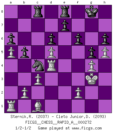 Last move : 1/2-1/2 2021 October 17 15:22:52 [Event "FICGS__CHESS__RAPID_A__000272"] [Site "FICGS"] [Date "2021.08.13"] [Round "1"] [White "Sternik,Ryszard"] [Black "Cleto Junior,Dirceu"] [Result "1/2-1/2"] [WhiteElo "2037"] [BlackElo "2093"] 1.e4 c5 2.Nf3 d6 3.d4 cxd4 4.Qxd4 Nc6 5.Qe3 g6 6.Bc4 Bg7 7.Nc3 Nf6 8.h3 b6 9.O-O O-O 10.Rd1 Bb7 11.Qe2 Na5 12.Ba6 Bxa6 13.Qxa6 Qc8 14.Qd3 Re8 15.Nd5 Nxd5 16.exd5 Qc4 17.Qxc4 Nxc4 18.Nd4 b5 19.a4 a6 20.c3 Bxd4 21.Rxd4 Nb6 22.a5 Nd7 23.Be3 f6 24.Kh2 Nc5 25.Ra3 Rac8 26.g4 Nd7 27.Ra1 Ne5 28.Kg3 Nc4 29.Bc1 g5 30.h4 h6 31.h5 1/2-1/2 Sicilian, Chekhover variation Kingside Castling by player White (move 9) Kingside Castling by player Black (move 9) This chess game ended in a draw. Follow this game move after move (download)Chess makes man wiser and clear-sighted. (Vladimir Putin) Auf jeden Fall musst du zuerst Rechtsanwalt werden, damit du deine eigenen Interessen und die deiner Familie vertreten kannst. [Brief an seinen Sohn] (José Raúl Capablanca) Fischer es el jugador mas fuerte del mundo. De hecho, el jugador mas fuerte que jamas haya existido. (Larry Evans) Karpov est une pièce de musée. (Garry Kasparov) Luck never made a man wise. (Seneca, Letters to Lucilius)