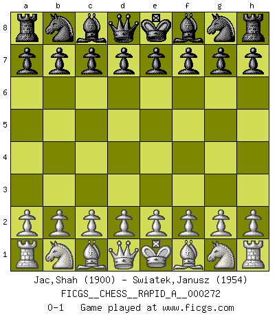 Last move : 0-1 2021 September 12 23:3:36 [Event "FICGS__CHESS__RAPID_A__000272"] [Site "FICGS"] [Date "2021.08.13"] [Round "1"] [White "Jac,Shah"] [Black "Swiatek,Janusz"] [Result "0-1"] [WhiteElo "1900"] [BlackElo "1954"] 0-1 This chess game has been lost on time (started : 2021.08.13 17:54:10) Player Black won this chess game. Follow this game move after move (download)A passed Pawn increases in strength as the number of pieces on the board diminishes. (Capablanca) Jeder Schachmeister war einmal ein Anfänger. (Irving Chernev) Cuando la partida de Ajedrez termina, el Peón y el Rey regresan a la misma caja. (Irish saying) L'action d'une oeuvre littéraire se déroule sur un champ de bataille. Les masques et les types du drame moderne correspondent aux pièces du jeu d'échecs. L'intrigue correspond aux coups et aux gambits, c'est à dire aux techniques du jeu telles qu'utilisées et interprétées par les joueurs. Les tactiques et les péripéties [mouvements] correspondent aux coups exécutés par l'adversaire. (Viktor Shklovsky) A proverb is a short sentence based on long experience. (Miguel de Cervantes)