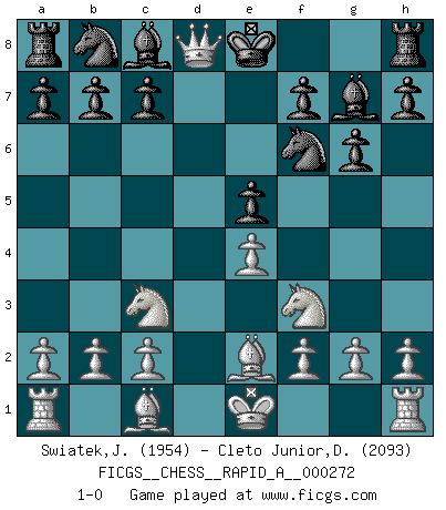 Last move : 1-0 2021 August 16 22:46:22 [Event "FICGS__CHESS__RAPID_A__000272"] [Site "FICGS"] [Date "2021.08.13"] [Round "1"] [White "Swiatek,Janusz"] [Black "Cleto Junior,Dirceu"] [Result "1-0"] [WhiteElo "1954"] [BlackElo "2093"] 1.e4 d6 2.d4 Nf6 3.Nc3 g6 4.Be2 Bg7 5.Nf3 e5 6.dxe5 dxe5 7.Qxd8+ 1-0 Pirc defense Player White won this chess game. Follow this game move after move (download)The most powerful weapon in Chess is to have the next move. (David Bronstein) Es tut gut, die Entwicklungsperiode von, [...] demokratischem Geist durchdringen zu lassen. Wie undemokratisch wäre es doch beispielsweise, den einen Offizier große Spaziertouren vornehmen zu lassen, während die anderen zu Hause säßen und sich entsetzlich langweilten. (Aaron Nimzowitsch) Dejen al perfeccionista jugar por correo. (Yasser Seirawan) Que feriez-vous si vous étiez en train de jouer aux échecs et que la fin du monde arrive ? Je continuerais à jouer. (Saint Borromée) CHESS, n. f. [echecs, Fr.] A nice and abstruse game, in which two sets of puppets are moved in opposition to each other. (Dr Samuel Johnson, A Dictionary Of The English Language, 1755)