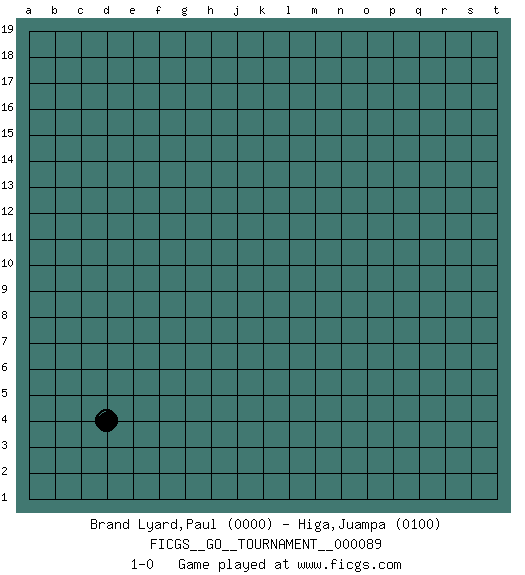 Last move : 1-0 2021 September 13 11:45:18 [Event "FICGS__GO__TOURNAMENT__000089"] [Site "FICGS"] [Date "2021.08.13"] [Round "1"] [Black "Brand Lyard,Paul"] [White "Higa,Juampa"] [Result "1-0"] [Rating 1 "0000"] [Rating 2 "0100"] 1.d4 1-0 This go game has been lost on time (started : 2021.08.13 19:5:26) Here are the names of the openings (joseki) played in the four corners : Corner d4 : d4 1-0 Hoshi (Hwajeom, Seongjeom, Xingwei`) 4-4 Point. The star or hoshi (4-4) point, emphasizing influence at the potential expense of territory. Player Black won this Go (weiqi, baduk) game. Follow this game move after move (download)Go is essentially a form of harmony. Go in the 21st century will have to be go of the 'harmony of the six points - the four quarters, the above and the below.' As in life we will need to view the whole rather than the part. Japanese go has focused too heavily on the local (joseki) rather than the whole for 300 years. The reason the Chinese and Koreans are overtaking the Japanese is that they are closer to achieve this whole-board view. (Go Seigen, 9p, 1994) Two beer, or not two beer. (Unknown)
