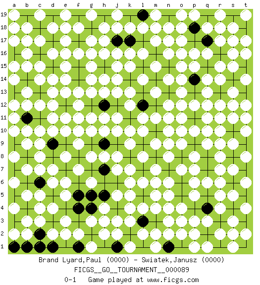 Last move : 0-1 2022 January 4 22:3:51 [Event "FICGS__GO__TOURNAMENT__000089"] [Site "FICGS"] [Date "2021.08.13"] [Round "1"] [Black "Brand Lyard,Paul"] [White "Swiatek,Janusz"] [Result "0-1"] [Rating 1 "0000"] [Rating 2 "0000"] 1.p4 q16 2.p5 d4 3.n3 d16 4.r10 r4 5.r14 q3 6.k17 r6 7.c2 e3 8.c1 h3 9.c10 b3 10.b13 g17 11.p17 r15 12.q15 p16 13.t1 q14 14.r16 s15 15.s14 p15 16.b4 c3 17.a3 a2 18.f3 f2 19.o15 o17 20.d5 c8 21.b8 b9 22.o16 n17 23.d17 e16 24.t15 s16 25.p14 q13 26.s4 s5 27.q17 r17 28.e4 e2 29.d15 c15 30.s6 s7 31.f4 b7 32.c16 c17 33.c18 d14 34.d3 a4 35.a13 b16 36.d1 c4 37.r3 r2 38.b6 d7 39.q2 p2 40.o2 p3 41.s8 r8 42.c13 e11 43.e12 f12 44.e13 f11 45.g12 f13 46.f14 g14 47.p13 p12 48.q8 r9 49.s9 q9 50.q7 q10 51.s10 s12 52.t12 q11 53.p11 q12 54.r13 r11 55.n18 o18 56.p19 m18 57.e9 d10 58.c11 c9 59.s11 s13 60.g5 g3 61.j3 j2 62.j1 k3 63.k2 h2 64.g2 g1 65.f1 l2 66.l1 m2 67.n2 m1 68.n1 k1 69.m3 n5 70.m5 n6 71.o6 n8 72.m8 m7 73.l7 l6 74.j6 m9 75.l9 l8 76.k8 l10 77.m10 k9 78.j9 j10 79.h10 j11 80.k11 h11 81.h12 g13 82.h13 h14 83.h15 j14 84.k14 j15 85.j16 k15 86.l15 k13 87.l13 k12 88.l12 l14 89.m14 l16 90.l17 m15 91.n15 m13 92.n13 n14 93.a16 b18 94.a18 a15 95.a14 b15 96.b14 d13 97.c12 e14 98.f15 f16 99.f17 e15 100.e17 h17 101.j17 h18 102.h19 j18 103.k18 j19 104.k19 f18 105.f19 g16 106.b19 b17 107.a17 a19 108.a18 a17 109.c19 a19 110.a9 a8 111.a7 a6 112.a1 b2 113.s1 s3 114.t3 t4 115.t5 t6 116.t17 t16 117.t18 t14 118.t13 r12 119.o1 t11 120.t10 t12 121.t9 t8 122.r1 s2 123.t2 q1 124.t3 t2 125.t1 s1 126.d19 k7 127.a11 b10 128.n19 o19 129.q19 a10 130.d9 f9 131.g9 f10 132.s19 r18 133.r19 s18 134.t9 q18 135.p18 t19 136.s19 s17 137.q17 t19 138.r19 t17 139.t18 d12 140.e12 e13 141.e7 e8 142.f8 g8 143.g7 h8 144.s14 r14 145.s10 s9 146.t10 r10 147.p9 s11 148.s10 t10 149.q4 o4 150.o5 n4 151.m4 o3 152.q19 p19 153.p18 m17 154.m16 n16 155.l18 m19 156.n19 n18 157.n11 e18 158.d18 a18 159.e19 g19 160.f19 e19 161.d19 d18 162.c18 c19 163.d17 e17 164.c5 b5 165.c6 e6 166.f6 f7 167.h7 e5 168.f5 t19 169.s19 r19 170.j4 h4 171.h5 k5 172.l5 k4 173.l4 p1 174.p6 o7 175.o8 o9 176.o10 p8 177.b11 c14 178.b12 d11 179.m12 o12 180.m11 a12 181.b12 b13 182.a13 a14 183.b1 d2 184.c11 c12 185.b11 a11 186.h6 k6 187.o14 o13 188.l19 h16 189.q5 r5 190.q6 r7 191.d8 e10 192.d9 c10 193.b11 b12 194.g4 j5 195.o15 o14 196.n10 p10 197.l11 k10 198.d6 c7 199.d5 d6 200.c6 c5 201.j4 j3 202.j12 g11 203.p14 n12 204.h9 j8 205.n15 o16 206.n15 o15 207.l3 m6 208.l4 p7 209.q7 o11 210.m3 n9 211.l12 l11 212.o6 p6 213.m10 m11 214.n10 o10 215.q8 q6 216.o5 p5 217.n1 n2 218.o1 o2 219.l5 m4 220.l3 n3 221.n1 m5 222.l5 j7 223.l3 l4 224.q4 g6 225.h7 g10 226.g4 j13 227.f5 g15 228.f4 k16 229.h5 n11 230.k17 k18 231.m10 n10 232.h12 h13 233.h9 h10 234.j17 j16 235.l19 l18 236.g5 0-1 Here are the names of the openings (joseki) played in the four corners : Corner q16 : q16 r14 Hoshi (Hwajeom, Seongjeom, Xingwei`) 4-4 Point. The star or hoshi (4-4) point, emphasizing influence at the potential expense of territory. Ikken Kakari (Hankan Keolch'im, Yi Gua`jiao~, 1-Space Low Approach). Black 2 is the standard approach move to the 4-4. Corner d4 : d4 c2 Hoshi (Hwajeom, Seongjeom, Xingwei`) 4-4 Point. The star or hoshi (4-4) point, emphasizing influence at the potential expense of territory. Corner d16 : d16 b13 Hoshi (Hwajeom, Seongjeom, Xingwei`) 4-4 Point. The star or hoshi (4-4) point, emphasizing influence at the potential expense of territory. Player White won this Go (weiqi, baduk) game. Follow this game move after move (download)A knight's move near the edge of the board cannot be cut. (Bill Taylor) The good fighters of old first put themselves beyond the possibility of defeat, and then waited for an opportunity of defeating the enemy. (Sun Tzu)