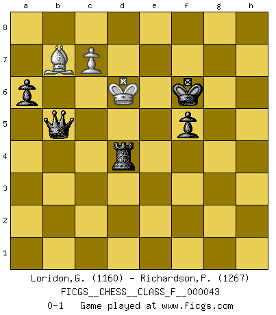Last move : 0-1 2007 August 3 1:39:20 [Event "FICGS__CHESS__CLASS_F__000043"] [Site "FICGS"] [Date "2007.07.14"] [Round "1"] [White "Loridon,Geoffroy"] [Black "Richardson,Patrick"] [Result "0-1"] [WhiteElo "1160"] [BlackElo "1267"] 1.d4 Nf6 2.Nc3 d5 3.e3 Bf5 4.g3 e6 5.h3 c5 6.Bb5+ Nbd7 7.g4 Bg6 8.dxc5 Bxc5 9.g5 Ne4 10.h4 Nxc3 11.bxc3 O-O 12.a4 Ne5 13.Nf3 Nxf3+ 14.Qxf3 Be4 15.Qh3 Bxh1 16.Qxh1 Qc7 17.Ba3 Bxa3 18.Rxa3 a6 19.Bd3 Qc5 20.Rb3 Rab8 21.h5 d4 22.exd4 Qxg5 23.Be4 Qc1+ 24.Ke2 Qxh1 25.Bxh1 b6 26.f4 f5 27.d5 exd5 28.Bxd5+ Kh8 29.c4 g6 30.hxg6 hxg6 31.Rh3+ Kg7 32.Rb3 Kf6 33.Ra3 Rh8 34.Ke1 Rh4 35.Rb3 Rxf4 36.a5 Re8+ 37.Kd1 Rd4+ 38.Kc1 Re1+ 39.Kb2 b5 40.Rd3 Rxd3 41.cxd3 Re5 42.Bb7 bxc4 43.dxc4 Rxa5 44.Kc3 g5 45.Kd4 g4 46.c5 g3 47.c6 g2 48.c7 g1Q+ 49.Kd3 Qb1+ 50.Kc4 Ra4+ 51.Kc5 Qb5+ 52.Kd6 Rd4+ 0-1 Queen's pawn game Kingside Castling by player Black (move 11) 10 pieces endgame at move 42 : White KBPP , Black KRPPPP WHITE : King + 1 Bishop 2 Pawns BLACK : King + 1 Rook 4 Pawns 9 pieces endgame at move 43 : White KBPP , Black KRPPP WHITE : King + 1 Bishop 2 Pawns BLACK : King + 1 Rook 3 Pawns 8 pieces endgame at move 43 : White KBP , Black KRPPP WHITE : King + 1 Bishop 1 Pawn BLACK : King + 1 Rook 3 Pawns Promotion Queen by player Black (move 48) Player Black won this chess game. Follow this game move after move (download)By the beauty of his games, the clarity of his play, and the brilliance of his ideas, Fischer made himself an artist of the same stature as Brahms, Rembrandt, and Shakespeare. (David Levy) Stelle das Brett so, daß die Sonne in die Augen deines Gegners scheint. (Ruy López) En la perfecta combinación de Ajedrez como en una historia corta de primera clase, toda la trama y contra trama deberá conducir hacia un final sorprendente, el interes no es mitigado hasta el último momento. (Yates and Winter) On a dit que l'homme se distingue de l'animal par le fait qu'il achète plus de livres qu'il ne peut en lire. Je voudrais suggérer qu'inclure à la liste des livres quelques livres d'échecs rendrait la distinction manifeste. (Edward Lasker) Now you put water in a cup, it becomes the cup; You put water into a bottle it becomes the bottle; You put it in a teapot it becomes the teapot. Water can flow or it can crash. Be water, my friend. (Bruce Lee)