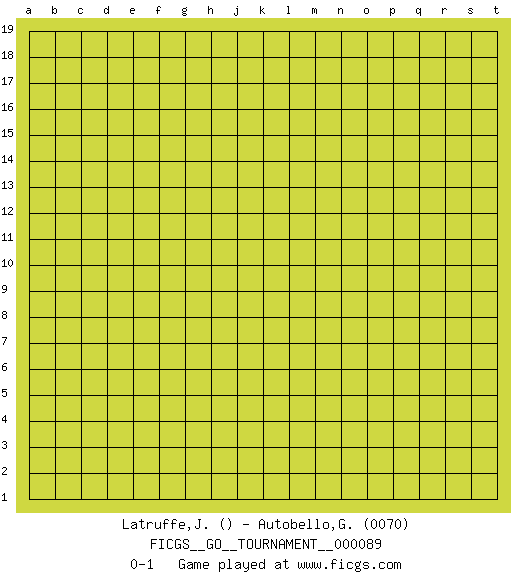 Last move : 0-1 2021 September 12 23:3:36 [Event "FICGS__GO__TOURNAMENT__000089"] [Site "FICGS"] [Date "2021.08.13"] [Round "1"] [Black "Latruffe,Jean Philippe"] [White "Autobello,Giovanni"] [Result "0-1"] [Rating 2 "0070"] 0-1 This go game has been lost on time (started : 2021.08.13 19:5:26) Here are the names of the openings (joseki) played in the four corners : Player White won this Go (weiqi, baduk) game. Follow this game move after move (download)One point in the center is worth ten in the corner. (Anonymous) Crush them ! Make them suffer ! (General Grievous in Star Wars ep.3)