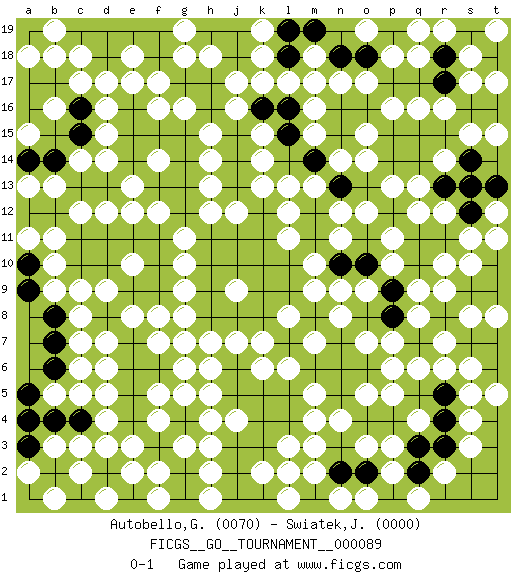 Last move : 0-1 2022 July 13 22:45:54 [Event "FICGS__GO__TOURNAMENT__000089"] [Site "FICGS"] [Date "2021.08.13"] [Round "1"] [Black "Autobello,Giovanni"] [White "Swiatek,Janusz"] [Result "0-1"] [Rating 1 "0070"] [Rating 2 "0000"] 1.k4 q4 2.k10 d4 3.k16 d16 4.d10 q16 5.q10 o3 6.r8 o17 7.e5 d5 8.e4 d3 9.e3 d7 10.d6 c6 11.e6 c8 12.b7 c7 13.b6 b5 14.a5 e2 15.d2 c2 16.d1 f2 17.b4 c5 18.c4 b3 19.a3 b10 20.b8 c9 21.c1 b1 22.a10 b9 23.c10 b11 24.c11 c12 25.d11 d12 26.a9 h4 27.e7 h6 28.e9 g7 29.e8 g9 30.f3 g3 31.g2 h2 32.g1 g5 33.j3 h3 34.j2 h1 35.j1 m4 36.e1 f1 37.b12 b13 38.a12 e12 39.e11 f12 40.f11 g11 41.c13 a11 42.b14 a13 43.f9 g10 44.h8 g8 45.g12 h12 46.g13 h13 47.g14 h14 48.g15 j16 49.j15 h15 50.h16 j17 51.h17 k17 52.h11 k15 53.j14 k13 54.h10 g16 55.l16 k14 56.j13 j12 57.j11 r12 58.g17 f16 59.e16 e17 60.e15 f17 61.c3 a4 62.b4 p11 63.k12 l12 64.k11 m10 65.m11 l11 66.l10 m9 67.m12 l13 68.l15 m13 69.n13 n14 70.o13 o14 71.m14 p13 72.n10 n9 73.f15 c17 74.d18 d17 75.h9 r6 76.f18 e18 77.e19 c18 78.d19 s10 79.l9 m7 80.a2 l8 81.k8 j9 82.j8 k7 83.k9 j7 84.b2 c3 85.c1 d1 86.j10 h7 87.p14 o12 88.n12 n11 89.o10 p10 90.p9 o9 91.q14 r16 92.n15 o15 93.o16 p16 94.n16 n17 95.m17 m18 96.l18 l17 97.n18 m16 98.m19 m17 99.p15 m15 100.l5 m5 101.m6 l6 102.n6 o5 103.o6 p6 104.p7 q6 105.q7 q9 106.p8 r9 107.s9 r10 108.q11 q12 109.a14 c14 110.d13 d14 111.e14 e13 112.c15 d15 113.c16 b16 114.j18 k18 115.l19 k19 116.r11 s11 117.a1 a4 118.a3 a2 119.n5 n4 120.t10 t11 121.t9 s8 122.s7 t8 123.q8 r7 124.n13 n12 125.t7 s6 126.b17 b18 127.a17 a18 128.a16 a15 129.t6 t5 130.j19 g18 131.f19 h18 132.h19 g19 133.p4 p3 134.o4 p5 135.a4 f5 136.j5 f4 137.n7 n8 138.o8 o7 139.l4 l3 140.l2 m3 141.o18 p18 142.p19 q18 143.q19 r19 144.r18 o19 145.p19 q19 146.k3 m2 147.m1 n1 148.n2 l1 149.o2 p2 150.p1 q1 151.q2 o1 152.s19 s18 153.r17 s17 154.s16 t19 155.r15 s15 156.t16 t17 157.j6 k6 158.k5 k2 159.k1 l2 160.f6 g6 161.s14 t15 162.f13 f14 163.q3 r2 164.r13 q13 165.f10 d9 166.r3 s3 167.r4 s4 168.r5 s5 169.p8 q8 170.p9 p7 171.d8 f7 172.s12 f8 173.c4 e10 174.e6 j9 175.e5 h5 176.e7 e8 177.e4 e3 178.f6 j4 179.s13 d6 180.q15 r14 181.c19 b19 182.t13 t12 0-1 Here are the names of the openings (joseki) played in the four corners : Corner d4 : d4 e5 Hoshi (Hwajeom, Seongjeom, Xingwei`) 4-4 Point. The star or hoshi (4-4) point, emphasizing influence at the potential expense of territory. Player White won this Go (weiqi, baduk) game. Follow this game move after move (download)If there is no stone on the handicap point, the carpenter's square is dead. (Anonymous) Life doesn't imitate art, it imitates bad television. (Woody Allen)
