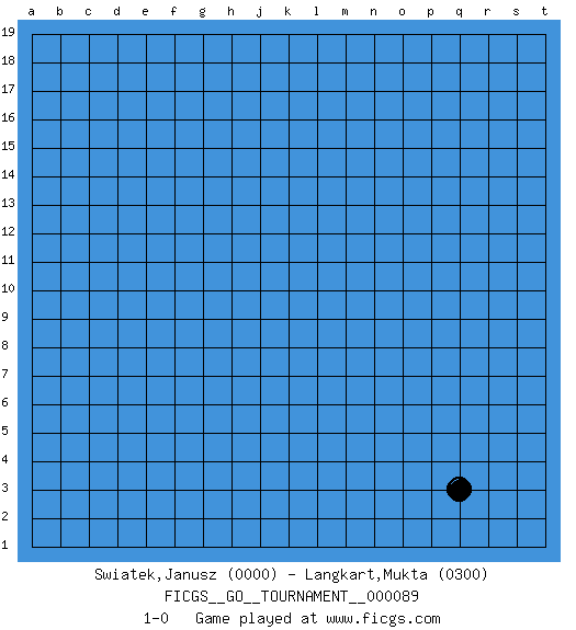 Last move : 1-0 2021 September 13 23:54:20 [Event "FICGS__GO__TOURNAMENT__000089"] [Site "FICGS"] [Date "2021.08.13"] [Round "1"] [Black "Swiatek,Janusz"] [White "Langkart,Mukta"] [Result "1-0"] [Rating 1 "0000"] [Rating 2 "0300"] 1.q3 1-0 This go game has been lost on time (started : 2021.08.13 19:5:26) Here are the names of the openings (joseki) played in the four corners : Corner q4 : q3 1-0 Komoku (Somok, Xiao~mu`) 3-4 Point. The komoku (3-4) point is the traditional corner enclosure move.. Player Black won this Go (weiqi, baduk) game. Follow this game move after move (download)There is death in the hane. (Anonymous) The human is the only animal species whose members are able to talk themselves into difficulties that would not otherwise exist. (Wendell Johnson)