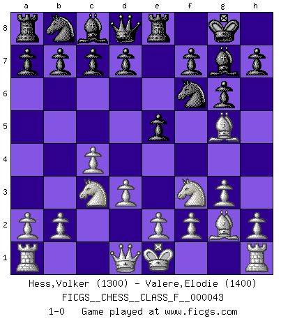 Last move : 1-0 2007 August 27 5:50:44 [Event "FICGS__CHESS__CLASS_F__000043"] [Site "FICGS"] [Date "2007.07.14"] [Round "1"] [White "Hess,Volker"] [Black "Valere,Elodie"] [Result "1-0"] [WhiteElo "1300"] [BlackElo "1400"] 1.c4 e5 2.Nc3 g6 3.g3 Bg7 4.Bg2 Nf6 5.d3 O-O 6.Nf3 Re8 7.Bg5 1-0 This chess game has been lost on time (started : 2007.07.14 16:56:38) English Opening Kingside Castling by player Black (move 5) Player White won this chess game. Follow this game move after move (download)Life is like a game of Chess, changing with each move. (Chinese proverb) Heutzutage gewinnt im Turnier nicht derjenige Spieler, der weitreichende Pläne entwirft, sondern einfach jener, der Zug um Zug kämpft. (David Bronstein) Fischer es una tragedia del Ajedrez Americano a la par con Morphy y Pillsbury. (Mig Greengard) Même si vous avez un bon coup à faire, regardez toujours s'il n'y en a pas un qui lui soit préférable. (Pedro Damiano) In theory there is no difference between theory and practice. In practice there is. (Yogi Berra)