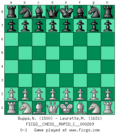 Last move : 0-1 2021 September 13 23:54:20 [Event "FICGS__CHESS__RAPID_C__000269"] [Site "FICGS"] [Date "2021.08.14"] [Round "1"] [White "Buppa,Natthawut"] [Black "Leurette,Marc-Antoine"] [Result "0-1"] [WhiteElo "1500"] [BlackElo "1631"] 0-1 This chess game has been lost on time (started : 2021.08.14 19:27:25) Player Black won this chess game. Follow this game move after move (download)Chess is a part of culture and if a culture is declining then Chess too will decline. (Mikhail Botvinnik) Unter Putin wird alles Geld aus Russland wie von einem Staubsauger nach Moskau umgeleitet, das ist wie ein schwarzes Loch. (Garry Kasparov) El pensamiento metódico es mas útil en el Ajedrez que la inspiración. (C. J. S. Purdy) La vie est comme un jeu d'échecs : nous esquissons un plan, mais celui-ci est tributaire de ce que daignent faire l'adversaire aux échecs et le destin dans la vie. (Arthur Schopenhauer) Locking firmely the window serves nothing, only small thiefs pass through there, the big thiefs enter through the front door. (Luc-Olivier Leclerc)