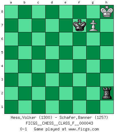 Last move : 0-1 2007 October 12 7:25:47 [Event "FICGS__CHESS__CLASS_F__000043"] [Site "FICGS"] [Date "2007.07.14"] [Round "1"] [White "Hess,Volker"] [Black "Schafer,Banner"] [Result "0-1"] [WhiteElo "1300"] [BlackElo "1257"] 1.c4 e5 2.Nc3 Nf6 3.g3 Bb4 4.Bg2 Nc6 5.Nf3 Bxc3 6.dxc3 d6 7.Bg5 h6 8.Bxf6 Qxf6 9.O-O O-O 10.Nd2 Bf5 11.b4 a6 12.a4 Rab8 13.b5 axb5 14.cxb5 Ne7 15.a5 Qe6 16.Re1 Bh3 17.Bh1 Nd5 18.c4 Nc3 19.Qb3 Nxb5 20.Qxb5 c6 21.Qb3 f5 22.Qc3 f4 23.a6 bxa6 24.Rxa6 fxg3 25.hxg3 Qf5 26.Qf3 Qc2 27.Qh5 Qxd2 28.Rea1 Qd4 29.Bf3 Bf5 30.Rc1 Rb1 31.Rxb1 Bxb1 32.Rxc6 Be4 33.Rc7 Bxf3 34.exf3 Qd1+ 35.Kg2 e4 36.Qd5+ Qxd5 37.cxd5 exf3+ 38.Kh3 Rf5 39.Kg4 Rxd5 40.Kxf3 Kh7 41.Rd7 Kg6 42.Ke4 Re5+ 43.Kf4 Re6 44.g4 Kf6 45.f3 g5+ 46.Kg3 Ke5 47.Rf7 d5 48.f4+ gxf4+ 49.Rxf4 Rc6 50.Rf8 Rg6 51.Rf5+ Ke6 52.Rh5 Kd6 53.Kf4 Kc5 54.Rh1 d4 55.Rc1+ Kd5 56.Kf5 Rg5+ 57.Kf4 Re5 58.Rd1 Re3 59.Rh1 Re4+ 60.Kf5 d3 61.Rd1 Kd4 62.Ra1 Re2 63.Kg6 d2 64.Rd1 Kd3 65.Kxh6 Kc2 66.Rxd2+ Kxd2 67.g5 Ke3 68.g6 Rh2+ 69.Kg7 Ke4 70.Kg8 Ke5 71.g7 Ke6 72.Kf8 Rf2+ 73.Kg8 Ke7 74.Kh8 Rh2+ 75.Kg8 Rg2 76.Kh7 Kf7 77.Kh8 Rh2+ 0-1 English : Bremen, Smyslov system Kingside Castling by player White (move 9) Kingside Castling by player Black (move 9) 10 pieces endgame at move 39 : White KRPP , Black KRPPPP WHITE : King + 1 Rook 2 Pawns BLACK : King + 1 Rook 4 Pawns 9 pieces endgame at move 40 : White KRPP , Black KRPPP WHITE : King + 1 Rook 2 Pawns BLACK : King + 1 Rook 3 Pawns 8 pieces endgame at move 48 : White KRP , Black KRPPP WHITE : King + 1 Rook 1 Pawn BLACK : King + 1 Rook 3 Pawns 7 pieces endgame at move 49 : White KRP , Black KRPP WHITE : King + 1 Rook 1 Pawn BLACK : King + 1 Rook 2 Pawns 6 pieces endgame at move 65 : White KRP , Black KRP WHITE : King + 1 Rook 1 Pawn BLACK : King + 1 Rook 1 Pawn 5 pieces endgame at move 66 : White KRP , Black KR WHITE : King + 1 Rook 1 Pawn BLACK : King + 1 Rook 4 pieces endgame at move 66 : White KP , Black KR WHITE : King + 1 Pawn BLACK : King + 1 Rook Player Black won this chess game. Follow this game move after move (download)Fischer is under obligation to nobody. (Joseph Platz) Je älter ich werde, um so mehr schätze ich die Bauern. (Paul Keres) Una buena ofensiva y una buena defensa, comienzan ambas con un buen desarrollo. (Bruce A. Moon) Nous vivons dans un monde échiquéen : chaque jour qui passe est un défi à relever. (Philosophe Sasha) Art is the only way to run away without leaving home. (Twyla Tharp)