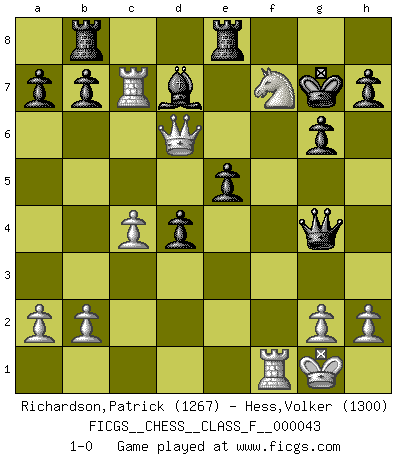 Last move : 1-0 2007 July 20 7:53:21 [Event "FICGS__CHESS__CLASS_F__000043"] [Site "FICGS"] [Date "2007.07.14"] [Round "1"] [White "Richardson,Patrick"] [Black "Hess,Volker"] [Result "1-0"] [WhiteElo "1267"] [BlackElo "1300"] 1.d4 d6 2.e4 Nf6 3.Nc3 g6 4.Nf3 Bg7 5.Bd3 O-O 6.O-O c5 7.dxc5 dxc5 8.e5 Nfd7 9.Bf4 Nc6 10.Re1 Nd4 11.Nxd4 cxd4 12.Ne2 Nxe5 13.Ng3 Nxd3 14.Qxd3 Re8 15.Be5 Bxe5 16.Rxe5 Qb6 17.Rb5 Qd6 18.Ne4 Qa6 19.c4 e5 20.f4 f6 21.fxe5 fxe5 22.Qb3 Kg7 23.Qb4 Rb8 24.Re1 Qc6 25.Rc5 Qe6 26.Rc7+ Kh8 27.Rf1 Bd7 28.Ng5 Qg4 29.Nf7+ Kg7 30.Qd6 1-0 Queen's Pawn Kingside Castling by player Black (move 5) Kingside Castling by player White (move 6) Player White won this chess game. Follow this game move after move (download)A good sacrifice is one that is not necessarily sound but leaves your opponent dazed and confused. (Rudolph Spielmann) Wir irren allesamt, nur jeder irrt anders. (Georg Christoph Lichtenberg) El Ajedrez es tan inspirador que yo no creo que un buen jugador sea capaz de tener un pensamiento malo durante una partida. (Wilhelm Steinitz) L'attaque fait le spectacle, la défense gagne les matchs. (Dicton footballistique) History is a gallery of pictures in which there are few originals and many copies. (Alexis de Tocqueville)
