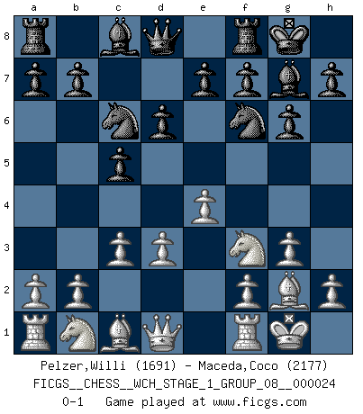 Last move : 0-1 2021 September 30 22:42:46 [Event "FICGS__CHESS__WCH_STAGE_1_GROUP_08__000024"] [Site "FICGS"] [Date "2021.08.15"] [Round "1"] [White "Pelzer,Willi"] [Black "Maceda,Coco"] [Result "0-1"] [WhiteElo "1691"] [BlackElo "2177"] 1.e4 c5 2.Nf3 Nc6 3.c3 Nf6 4.d3 g6 5.g3 Bg7 6.Bg2 O-O 7.O-O d6 0-1 This chess game has been lost on time (started : 2021.08.15 16:48:40) Sicilian defense Kingside Castling by player Black (move 6) Kingside Castling by player White (move 7) Player Black won this chess game. Follow this game move after move (download)Why must I lose to this idiot ? (Aron Nimzovich) Wenn Capablanka heute auf der Schachbühne erscheinen würde, hätte er ein halbes Jahr gebraucht um sich die Schachtheorie anzueignen. Und dann hätte er alles und jeden besiegt. (Mikhail Moiseyevich Botvinik) La vida es como un juego de Ajedrez, cambiando con cada movimiento. (Proverbio Chino) Je ne crois pas en la psychologie, je crois aux bons coups. (Robert Fischer) What doesn't kill us makes us stronger. (Friedrich Nietzsche)