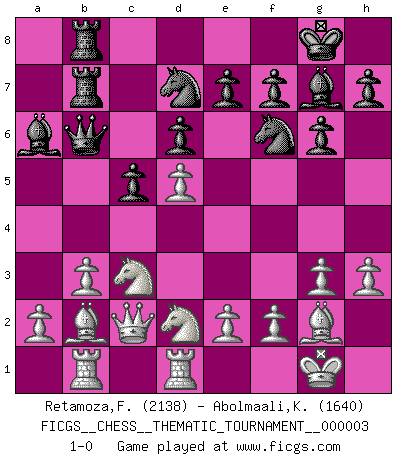 Last move : 1-0 2006 October 29 19:49:38 [Event "FICGS__CHESS__THEMATIC_TOURNAMENT__000003"] [Site "FICGS"] [Date "2006.06.24"] [Round "1"] [White "Retamoza,Francisco"] [Black "Abolmaali,Kayvan"] [Result "1-0"] [WhiteElo "2138"] [BlackElo "1640"] 1.d4 Nf6 2.c4 c5 3.d5 b5 4.cxb5 a6 5.bxa6 Bxa6 6.Nc3 d6 7.g3 g6 8.Bg2 Bg7 9.Nf3 Nbd7 10.O-O Qb6 11.Qc2 O-O 12.Rd1 Rfb8 13.Rb1 Bc4 14.b3 Ba6 15.Bb2 Rb7 16.Nd2 Rab8 17.h3 1-0 This chess game has been lost on time (started : 2006.06.24 13:30:12) Benko gambit accepted Kingside Castling by player White (move 10) Kingside Castling by player Black (move 11) Player White won this chess game. Follow this game move after move (download)Half the variations which are calculated in a tournament game turn out to be completely superfluous. Unfortunately, no one knows in advance which half. (Jan Tinman) Der 70jährige Viktor Kortschnoi: Die Rentenanstalt wollte mich zwingen in Rente zu gehen. Meine Frau erhält jetzt eine Pension- und ich zahle weiter in die Rentenkasse ein! (Viktor Kortschnoi) Todo lo que importa ante el tablero de Ajedrez son buenas jugadas. (Bobby Fischer) Pour moi, les échecs ne sont pas un jeu mais un art. (Alexandre Alekhine) Tomorrow's what you make of it. (Horatio Caine, C.S.I. Miami)