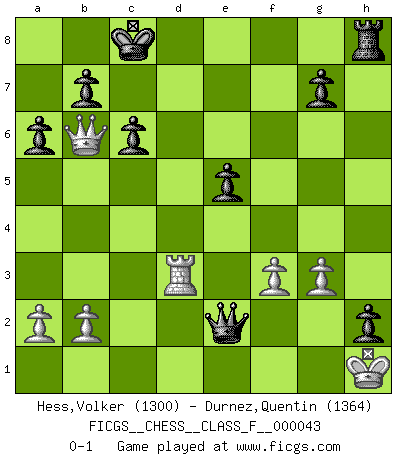 Last move : 0-1 2007 July 31 14:30:13 [Event "FICGS__CHESS__CLASS_F__000043"] [Site "FICGS"] [Date "2007.07.14"] [Round "1"] [White "Hess,Volker"] [Black "Durnez,Quentin"] [Result "0-1"] [WhiteElo "1300"] [BlackElo "1364"] 1.c4 Nf6 2.Nc3 e5 3.g3 d5 4.Bg2 dxc4 5.Nf3 Nc6 6.O-O Bd7 7.d3 cxd3 8.Qxd3 Bd6 9.Bg5 h6 10.Bxf6 Qxf6 11.Ne4 Qg6 12.Nxd6+ Qxd6 13.Qe4 f5 14.Qe3 O-O-O 15.Nd2 f4 16.Qc3 fxg3 17.hxg3 Nd4 18.Qd3 Bg4 19.Nf3 Bxf3 20.Bxf3 Nxf3+ 21.Qxf3 h5 22.Rad1 Qf6 23.Qa3 a6 24.Rc1 h4 25.Qc5 c6 26.Rc3 h3 27.Qb6 h2+ 28.Kh1 Qd6 29.Rd3 Qg6 30.Rfd1 Rxd3 31.Rxd3 Qe4+ 32.f3 Qxe2 0-1 English Opening Kingside Castling by player White (move 6) Queenside Castling by player Black (move 14) Player Black won this chess game. Follow this game move after move (download)Chess is a foolish expedient for making idle people believe they are doing something very clever when they are only wasting their time. (George Bernard Shaw) Du musst Deinen Gegner in einen tiefen dunklen Wald führen wo 2+2=5 ist und wo der Weg, der wieder hinausführt, nur breit genug für einen ist. (Mikhail Nekhemyevich Tal) Los Peones son el alma de una partida de Ajedrez. (Francois Andre Danican Philidor) Une platitude souvent récitée à propos des Echecs est qu'une des choses les plus difficiles à réaliser est de gagner une position gagnante. Cela ne manque pas de sens mais, pour ma part, j'ai toujours trouvé plus difficile de gagner une position perdante. (Tim Krabbe) Luck has a peculiar habit of favoring those who don't depend on it. (Author unknown)
