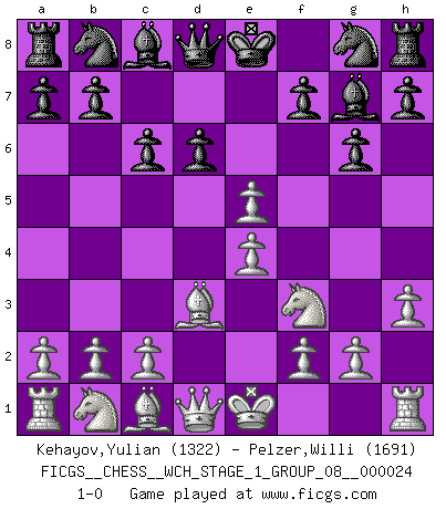 Last move : 1-0 2021 September 30 8:16:41 [Event "FICGS__CHESS__WCH_STAGE_1_GROUP_08__000024"] [Site "FICGS"] [Date "2021.08.15"] [Round "1"] [White "Kehayov,Yulian"] [Black "Pelzer,Willi"] [Result "1-0"] [WhiteElo "1322"] [BlackElo "1691"] 1.e4 d6 2.d4 g6 3.Bd3 Bg7 4.Nf3 c6 5.h3 e5 6.dxe5 1-0 This chess game has been lost on time (started : 2021.08.15 16:48:40) King's pawn Opening Player White won this chess game. Follow this game move after move (download)Dazzling combinations are for the many, shifting wood is for the few. (Georg Kieninger) Auf Remis zu spielen ist gewissermaßen ein Verbrechen gegen das Schachspiel. (Mikhail Nekhemyevich Tal) Solo puedes ser bueno en el Ajedrez si amas al juego. (Bobby Fischer) Horreur, mais aussi harmonie suprême : qu'y avait-il en effet au monde en dehors des échecs ? Le brouillard, l'inconnu, le non-être... (Vladimir Nabokov) It's unlucky to be superstitious. (Dave Enteles)
