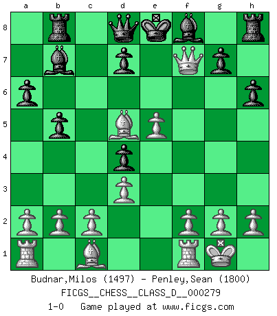 Last move : 1-0 2021 September 25 11:28:38 [Event "FICGS__CHESS__CLASS_D__000279"] [Site "FICGS"] [Date "2021.08.17"] [Round "1"] [White "Budnar,Milos"] [Black "Penley,Sean"] [Result "1-0"] [WhiteElo "1497"] [BlackElo "1800"] 1.e4 c5 2.Nf3 Nf6 3.Nc3 e6 4.Bb5 a6 5.Ba4 Nc6 6.O-O Nd4 7.Nxd4 cxd4 8.e5 Nd5 9.Nxd5 exd5 10.d3 b5 11.Bb3 Bb7 12.Qf3 h6 13.Bxd5 Rb8 14.Qxf7+ 1-0 Sicilian : Nimzovich-Rubinstein variation Kingside Castling by player White (move 6) Player White won this chess game. Follow this game move after move (download)Life is like a game of Chess, changing with each move. (Chinese proverb) Schach ist ein Reich, wo sich die menschliche Phantasie frei entfalten kann. (David Bronstein) Fischer no está bajo la obligación de nadie. (Joseph Platz) Même si vous avez un bon coup à faire, regardez toujours s'il n'y en a pas un qui lui soit préférable. (Pedro Damiano) There is far too much law for those who can afford it and far too little for those who cannot. (Derek Bok)