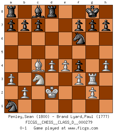 Last move : 0-1 2021 September 24 21:30:54 [Event "FICGS__CHESS__CLASS_D__000279"] [Site "FICGS"] [Date "2021.08.17"] [Round "1"] [White "Penley,Sean"] [Black "Brand Lyard,Paul"] [Result "0-1"] [WhiteElo "1800"] [BlackElo "1777"] 1.c4 e6 2.d4 Bb4+ 3.Bd2 Bxd2+ 4.Qxd2 d5 5.cxd5 Qxd5 6.f3 Nf6 7.e4 Qh5 8.Nh3 O-O 9.Be2 Nc6 10.Nf4 Qg5 11.Nc3 Nb4 12.h4 Qg3+ 13.Kd1 Rd8 14.Rh3 Qf2 15.a3 Qg1+ 16.Qe1 Qxe1+ 17.Kxe1 Nc2+ 18.Kd2 Nxa1 19.Bc4 e5 20.Rg3 exf4 0-1 English Opening Kingside Castling by player Black (move 8) Player Black won this chess game. Follow this game move after move (download)There are tough players and nice guys, and I'm a tough player. (Bobby Fischer) Wer der Ansicht ist, daß alle Schachspieler verrückt sind, wird durch Studium des Lebens von Emil Josef Diemer nicht auf andere Gedanken kommen. (Hans Ree) El Ajedrez es un invernadero donde los frutos del carácter pueden madurar mas completamente que en la vida. (Edward Morgan Foster) Les échecs, c'est la lutte contre l'erreur. (Johannes Zukertort) I believe in luck. How else can you explain the success of those you dislike ? (Jean Cocteau)