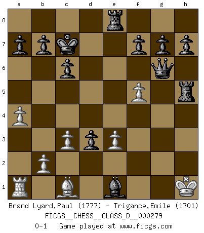 Last move : 0-1 2021 August 25 5:54:54 [Event "FICGS__CHESS__CLASS_D__000279"] [Site "FICGS"] [Date "2021.08.17"] [Round "1"] [White "Brand Lyard,Paul"] [Black "Trigance,Emile"] [Result "0-1"] [WhiteElo "1777"] [BlackElo "1701"] 1.f4 d5 2.Nf3 Nf6 3.e3 Bg4 4.h4 Nbd7 5.c3 e5 6.fxe5 Nxe5 7.Be2 Bxf3 8.gxf3 Qd7 9.a4 Bd6 10.Bb5 c6 11.Be2 Nc4 12.Bxc4 Bg3+ 13.Ke2 dxc4 14.Kf1 Qf5 15.f4 Nh5 16.Qf3 O-O-O 17.Rg1 Bxh4 18.Rh1 Ng3+ 19.Kg2 Nxh1 20.Kxh1 Rd6 21.d4 cxd3 22.Nd2 Rh6 23.Ne4 Qg6 24.Nd6+ Kc7 25.Ne8+ Rxe8 26.f5 Be1 27.Qh5 Rxh5+ 0-1 Bird's Opening Queenside Castling by player Black (move 16) Player Black won this chess game. Follow this game move after move (download)Bobby Fischer is the greatest Chess genius of all time ! (Alexander Kotov) Die Partien sind immer verschieden, die Interviews immer die gleichen. (Garry Kasparov) El hombre es un frívolo, una creatura engañosa y como un jugador de Ajedrez, se preocupa mas por el proceso de obtener su meta que de la meta por sí misma. (Dostoyevsky) Le génie consiste à savoir transgresser les règles au moment opportun. (Teichmann) There is no vagueness without wind. (Chinese proverb)