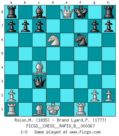 Last move : 1-0 2021 August 20 21:59:14 [Event "FICGS__CHESS__RAPID_B__000367"] [Site "FICGS"] [Date "2021.08.18"] [Round "1"] [White "Rolon,Maximiliano"] [Black "Brand Lyard,Paul"] [Result "1-0"] [WhiteElo "1835"] [BlackElo "1777"] 1.e4 e5 2.Nf3 Nc6 3.Bc4 Bc5 4.c3 Qf6 5.d4 exd4 6.e5 Nxe5 7.Qe2 dxc3 8.Nxe5 Bxf2+ 9.Kd1 Bd4 10.Nxf7 Kf8 11.Nxc3 Bxc3 12.bxc3 d6 13.Rf1 Qxc3 14.Nxd6 Nf6 15.Qe8+ 1-0 Giuoco Piano Player White won this chess game. Follow this game move after move (download)Pawn endings are to Chess what putting is to golf. (Cecil Purdy) Wenn es im Universum noch irgendwo intelligente Lebewesen gibt, dann kennen sie Go. (Emanuel Lasker) Un entendimiento minucioso de las típicas continuaciones de mate hacen de las mas complicadas combinaciones de sacrificio que conducen hacia ellas no solo no dificiles, sino casi un asunto de rutina. (Siegbert Tarrasch) Je ne crois pas en la psychologie, je crois aux bons coups. (Robert Fischer) He who is a good ruler must first have been ruled. (Aristotle)