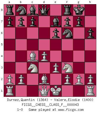 Last move : 1-0 2007 August 25 5:30:12 [Event "FICGS__CHESS__CLASS_F__000043"] [Site "FICGS"] [Date "2007.07.14"] [Round "1"] [White "Durnez,Quentin"] [Black "Valere,Elodie"] [Result "1-0"] [WhiteElo "1364"] [BlackElo "1400"] 1.d4 d5 2.c4 e6 3.Nc3 Nf6 4.Bg5 Be7 5.Nf3 h6 6.Bd2 O-O 7.e3 dxc4 8.Bxc4 1-0 This chess game has been lost on time (started : 2007.07.14 16:56:38) QGD : 4.Bg5 Be7 Kingside Castling by player Black (move 6) Player White won this chess game. Follow this game move after move (download)I'm not a materialistic person, in that, I don't suffer the lack or loss of money. The absence of worldly goods I don't look back on. For Chess is a way I can be as materialistic as I want without having to sell my soul. (Jamie Walter Adams) Wenn ich einen Club besuche, sind die Spieler stumm vor Staunen. (José Raúl Capablanca) Combinaciones deslumbrantes son para la mayoría, mover madera es para los pocos. (Georg Kieninger) Le temps de noter son nom sur la feuille de partie, j'étais déjà en zeitnot ! D'un modeste amateur apparié lors de la première ronde d'un open contre le grand-maître Azmaïparashvili. I know the human being and fish can coexist peacefully. (George W. Bush, Saginaw sept. 29, 2000)