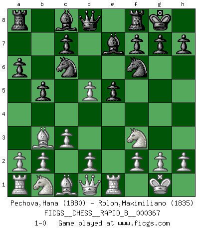 Last move : 1-0 2021 November 16 12:18:59 [Event "FICGS__CHESS__RAPID_B__000367"] [Site "FICGS"] [Date "2021.08.18"] [Round "1"] [White "Pechova,Hana"] [Black "Rolon,Maximiliano"] [Result "1-0"] [WhiteElo "1880"] [BlackElo "1835"] 1.e4 e5 2.Nf3 Nc6 3.Bb5 a6 4.Ba4 Nf6 5.O-O Be7 6.Re1 b5 7.Bb3 O-O 8.c3 d5 9.exd5 1-0 This chess game has been lost on time (started : 2021.08.18 1:35:30) Ruy Lopez : Closed, 7...O-O Kingside Castling by player White (move 5) Kingside Castling by player Black (move 7) Player White won this chess game. Follow this game move after move (download)Different people feel differently about resigning. (Bobby Fischer) Ich habe die Schachforschung dermaßen betrieben, dass sie auf eine wissenschaftliche Basis gestellt wurde. (Mikhail Moiseyevich Botvinik) El Ajedrez no es una pizca de inferior al violín, y tenemos un gran número de violinistas profesionales. (Mikhail Botvinnik) La solitude du joueur d'Echecs à l'approche du mat est semblable à celle du condamné. (Francis Szpiner) Dave, my mind is going. I can feel it. (HAL 9000 in 2001, a space odyssey)