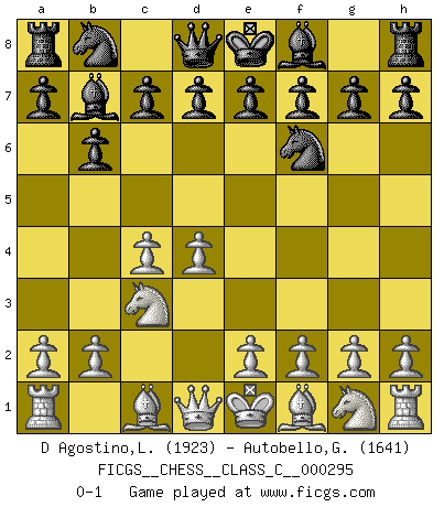 Last move : 0-1 2021 October 14 2:27:21 [Event "FICGS__CHESS__CLASS_C__000295"] [Site "FICGS"] [Date "2021.08.18"] [Round "1"] [White "D Agostino,Leonardo"] [Black "Autobello,Giovanni"] [Result "0-1"] [WhiteElo "1923"] [BlackElo "1641"] 1.d4 Nf6 2.c4 b6 3.Nc3 Bb7 0-1 This chess game has been lost on time (started : 2021.08.18 9:20:59) Queen's Indian Accelerated Player Black won this chess game. Follow this game move after move (download)I give 98 percent of my mental energy to Chess. Others give only 2 percent. (Bobby Fischer) Alles was am Schachbrett zählt sind gute Züge. (Robert James Fischer) Un juego de Ajedrez es un dialogo, una conversación entre un jugador y su oponente. Cada movimiento del oponente puede contener amenazas o tropiezos, pero un jugador no se puede defender de las amenazas o tomar ventaja de los tropiezos si es que no se pregunta a sí mismo: ¿Que es lo que mi oponente va a hacer después de cada movida?. (Bruce A. Moon) Plusieurs personnes se sont demandées comment Tal faisait pour gagner... En fait, c'est très simple ! Il met ses pièces au centre de l'échiquier et les sacrifie quelque part ! (David Bronstein) All politicians must be presumed guilty until they are proven innocent. (Dinesh De Silva)