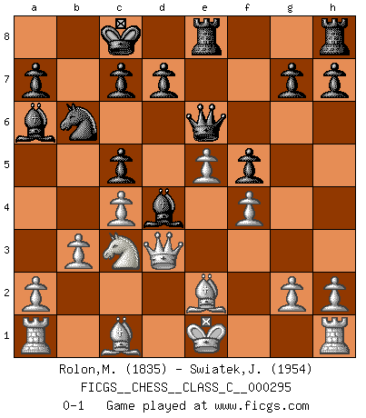 Last move : 0-1 2021 December 2 6:59:49 [Event "FICGS__CHESS__CLASS_C__000295"] [Site "FICGS"] [Date "2021.08.18"] [Round "1"] [White "Rolon,Maximiliano"] [Black "Swiatek,Janusz"] [Result "0-1"] [WhiteElo "1835"] [BlackElo "1954"] 1.e4 e5 2.Nf3 Nc6 3.d4 exd4 4.Nxd4 Nf6 5.Nxc6 bxc6 6.e5 Qe7 7.Qe2 Nd5 8.c4 Nb6 9.Nc3 Ba6 10.Qe4 Qe6 11.b3 O-O-O 12.Be2 Re8 13.f4 f5 14.Qc2 Bc5 15.Bb2 Be3 16.Bc1 Bd4 17.Qd3 c5 0-1 This chess game has been lost on time (started : 2021.08.18 9:20:59) Scotch : Mieses variation Queenside Castling by player Black (move 11) Player Black won this chess game. Follow this game move after move (download)White lost because he failed to remember the right continuation and had to think up the moves himself. (Siegbert Tarrasch) Es genügt nicht ein guter Spieler zu sein, man muß auch gut spielen. (Siegbert Tarrasch) El Ajedrez es parte de una cultura y si una cultura esta en decadencia, entonces también el Ajedrez declinará. (Mikhail Botvinnik) Même si vous avez un bon coup à faire, regardez toujours s'il n'y en a pas un qui lui soit préférable. (Pedro Damiano) If things go wrong, don't go with them. (Roger Babson)