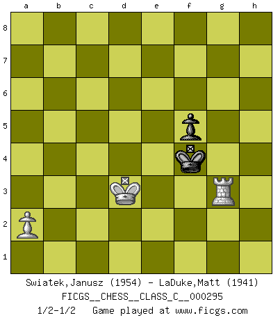 Last move : 1/2-1/2 2021 October 2 4:32:55 [Event "FICGS__CHESS__CLASS_C__000295"] [Site "FICGS"] [Date "2021.08.18"] [Round "1"] [White "Swiatek,Janusz"] [Black "LaDuke,Matt"] [Result "1/2-1/2"] [WhiteElo "1954"] [BlackElo "1941"] 1.d4 Nf6 2.c4 g6 3.Nc3 d5 4.Nf3 Bg7 5.Qb3 dxc4 6.Qxc4 O-O 7.Bf4 Be6 8.Qxc7 Nc6 9.e3 Rc8 10.Qxd8 Rfxd8 11.Bg3 Nb4 12.Kd2 Nd7 13.Be2 Nc5 14.Rhd1 Bf5 15.Bf1 h5 16.Rac1 Nbd3 17.Rb1 e5 18.Bxd3 Nxd3 19.d5 b5 20.e4 b4 21.Kxd3 bxc3 22.bxc3 Rxd5+ 23.Nd4 exd4 24.c4 Bxe4+ 25.Kxe4 Rdc5 26.Rb8 Rxc4 27.Rdb1 f5+ 28.Kd3 Rc3+ 29.Ke2 d3+ 30.Kd2 Bh6+ 31.f4 h4 32.Rxc8+ Rxc8 33.Bxh4 Rc2+ 34.Kxd3 Rxg2 35.Rb8+ Kf7 36.Rb7+ Ke6 37.Re7+ Kd6 38.Rxa7 Bxf4 39.Bg3 Bxg3 40.Ra6+ Ke5 41.Rxg6 Kf4 42.hxg3+ Rxg3+ 43.Rxg3 1/2-1/2 King's Indian defense, 3.Nc3 Kingside Castling by player Black (move 6) 10 pieces endgame at move 38 : White KRBPP , Black KRBPP WHITE : King + 1 Rook 1 Bishop 2 Pawns BLACK : King + 1 Rook 1 Bishop 2 Pawns 9 pieces endgame at move 39 : White KRPP , Black KRBPP WHITE : King + 1 Rook 2 Pawns BLACK : King + 1 Rook 1 Bishop 2 Pawns 8 pieces endgame at move 41 : White KRPP , Black KRBP WHITE : King + 1 Rook 2 Pawns BLACK : King + 1 Rook 1 Bishop 1 Pawn 7 pieces endgame at move 42 : White KRPP , Black KRP WHITE : King + 1 Rook 2 Pawns BLACK : King + 1 Rook 1 Pawn 6 pieces endgame at move 42 : White KRP , Black KRP WHITE : King + 1 Rook 1 Pawn BLACK : King + 1 Rook 1 Pawn 5 pieces endgame at move 43 : White KRP , Black KP WHITE : King + 1 Rook 1 Pawn BLACK : King + 1 Pawn This chess game ended in a draw. Follow this game move after move (download)My God, Bobby Fischer plays so simply. (Alexei Suetin) Auf jeden Fall musst du zuerst Rechtsanwalt werden, damit du deine eigenen Interessen und die deiner Familie vertreten kannst. [Brief an seinen Sohn] (José Raúl Capablanca) La última cosa en que Fischer estaba interesado era en tonterías, siempre y cuando el Ajedrez estuviera involucrado. (Elie Agur) Seul un grand joueur sait à quel point il joue faiblement. (Xavier Tartacover) Players are not good because they find tactics, it is about the way to find the positions in which those tactics are hidden. (Luc-Olivier Leclerc)