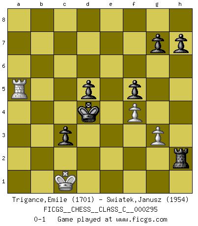 Last move : 0-1 2021 November 15 15:4:54 [Event "FICGS__CHESS__CLASS_C__000295"] [Site "FICGS"] [Date "2021.08.18"] [Round "1"] [White "Trigance,Emile"] [Black "Swiatek,Janusz"] [Result "0-1"] [WhiteElo "1701"] [BlackElo "1954"] 1.d4 Nf6 2.c4 e6 3.Nc3 Bb4 4.Bg5 c5 5.d5 d6 6.e3 exd5 7.cxd5 Nbd7 8.Bd3 Qa5 9.Bxf6 Nxf6 10.Nge2 Nxd5 11.Qc2 Bxc3+ 12.Nxc3 Bd7 13.a3 Nxc3 14.Qxc3 Qxc3+ 15.bxc3 O-O-O 16.Be4 Rhe8 17.Bd5 f6 18.Rb1 b6 19.O-O Kc7 20.c4 a6 21.Rb2 Be6 22.e4 Bxd5 23.exd5 Re4 24.Rfb1 Rb8 25.Rc1 b5 26.cxb5 axb5 27.Rcb1 Ra4 28.Rxb5 Rxb5 29.Rxb5 Rxa3 30.Kf1 Rd3 31.Ra5 Kb6 32.Ra8 Rxd5 33.Rb8+ Kc6 34.Rc8+ Kb5 35.Rc7 Rg5 36.f4 Rg6 37.g3 d5 38.Ke2 Kc4 39.Ra7 Kd4 40.Ra4+ c4 41.Ra1 f5 42.Rd1+ Kc5 43.Ra1 Kd4 44.Rd1+ Kc5 45.Ra1 Re6+ 46.Kd2 Kd4 47.Ra5 c3+ 48.Kc2 Re2+ 49.Kc1 Rxh2 0-1 Nimzo-Indian : Leningrad variation Queenside Castling by player Black (move 15) Kingside Castling by player White (move 19) Player Black won this chess game. Follow this game move after move (download)I played Chess with him and would have beaten him sometimes only he always took back his last move, and ran the game out differently. (Mark Twain) Im Reiche der Wirklichkeit ist man nie so glücklich wie im Reiche der Gedanken. (Arthur Schopenhauer) Siempre es mejor sacrificar los hombres de tu oponente. (Savielly Tartakower) Celui qui prend des risques peut perdre, celui qui n'en prend pas perd toujours. (Xavier Tartacover) Somewhere in the world there is an epigram for every dilemma. (Hendrik Willem van Loon)
