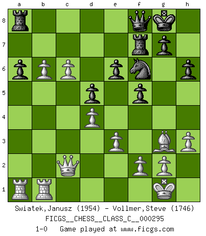 Last move : 1-0 2021 October 20 0:14:37 [Event "FICGS__CHESS__CLASS_C__000295"] [Site "FICGS"] [Date "2021.08.18"] [Round "1"] [White "Swiatek,Janusz"] [Black "Vollmer,Steve"] [Result "1-0"] [WhiteElo "1954"] [BlackElo "1746"] 1.d4 d5 2.c4 e6 3.Nc3 Nf6 4.Nf3 Bb4 5.Bg5 O-O 6.e3 a6 7.Qb3 Bxc3+ 8.Qxc3 Nbd7 9.c5 c6 10.Bd3 Re8 11.O-O b6 12.b4 b5 13.a4 Bb7 14.h3 h6 15.Bf4 Qe7 16.Qc2 Rec8 17.Rfb1 Qe8 18.Bg3 Qf8 19.Nd2 Ne8 20.Nb3 f5 21.Na5 Ra7 22.Nxc6 Bxc6 23.axb5 Bxb5 24.Bxb5 Rca8 25.Bxd7 Rxd7 26.b5 Nf6 27.b6 Rf7 28.c6 1-0 QGD : Ragozin variation Kingside Castling by player Black (move 5) Kingside Castling by player White (move 11) Player White won this chess game. Follow this game move after move (download)Winning isn't everything... but losing is nothing. (Mednis) Jeder Schachmeister war einmal ein Anfänger. (Irving Chernev) Botvinnik trataba de restarle el misterio al Ajedrez, siempre relacionandolo a situaciones de la vida ordinaria. El gustaba de llamar al Ajedrez un típico problema inexacto similar a aquellos de los cuales la gente siempre tiene que enfrentarse en la vida cotidiana. (Garry Kasparov) La solitude du joueur d'Echecs à l'approche du mat est semblable à celle du condamné. (Francis Szpiner) If you know the enemy and know yourself you need not fear the results of a hundred battles. (Sun Tzu)