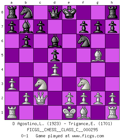 Last move : 0-1 2021 October 2 13:41:1 [Event "FICGS__CHESS__CLASS_C__000295"] [Site "FICGS"] [Date "2021.08.18"] [Round "1"] [White "D Agostino,Leonardo"] [Black "Trigance,Emile"] [Result "0-1"] [WhiteElo "1923"] [BlackElo "1701"] 1.d4 Nf6 2.c4 e6 3.Nf3 b6 4.a3 Ba6 5.Qc2 d5 6.cxd5 exd5 7.Nc3 Bd6 8.Bg5 Bb7 0-1 This chess game has been lost on time (started : 2021.08.18 9:20:59) Queen's Indian : Petrosian system Player Black won this chess game. Follow this game move after move (download)Your body has to be in top condition. Your Chess deteriorates as your body does. You can't separate body from mind. (Bobby Fischer) In der Schule lernt man nichts. Es ist nur Zeitverschwendung. (Robert James Fischer) En posiciones complicadas, Bobby Fischer pocas veces tuvo que temer de cualquiera. (Paul Keres) On n'a jamais que l'âge auquel on a commence à jouer aux échecs car après on cesse de vieillir. (Capablanca) Good luck. You're gonna need it. (Han Solo in Star Wars ep.6)