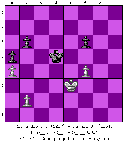 Last move : 1/2-1/2 2007 July 28 15:17:16 [Event "FICGS__CHESS__CLASS_F__000043"] [Site "FICGS"] [Date "2007.07.14"] [Round "1"] [White "Richardson,Patrick"] [Black "Durnez,Quentin"] [Result "1/2-1/2"] [WhiteElo "1267"] [BlackElo "1364"] 1.d4 d5 2.c4 e6 3.Nf3 Nf6 4.Nc3 Bb4 5.Bd2 c5 6.a3 Bxc3 7.Bxc3 cxd4 8.Qxd4 Nc6 9.Qh4 O-O 10.Bxf6 Qxf6 11.Qxf6 gxf6 12.cxd5 exd5 13.e3 Kh8 14.Be2 Rg8 15.g3 Bg4 16.h3 Bxf3 17.Bxf3 Rad8 18.O-O-O Ne7 19.e4 dxe4 20.Rxd8 Rxd8 21.Bxe4 b6 22.Rd1 Rxd1+ 23.Kxd1 Kg7 24.g4 Nc8 25.a4 Nd6 26.Bd3 Kh6 27.Ke2 Kg5 28.Kf1 h5 29.f3 hxg4 30.hxg4 f5 31.gxf5 Nxf5 32.Bxf5 Kxf5 33.Ke2 Ke5 34.Ke3 a5 35.f4+ Kd5 36.Kd3 f6 37.Ke3 1/2-1/2 Queen's gambit declined Kingside Castling by player Black (move 9) Queenside Castling by player White (move 18) 10 pieces endgame at move 31 : White KBPPP , Black KNPPP WHITE : King + 1 Bishop 3 Pawns BLACK : King + 1 Knight 3 Pawns 9 pieces endgame at move 32 : White KBPPP , Black KPPP WHITE : King + 1 Bishop 3 Pawns BLACK : King + 3 Pawns 8 pieces endgame at move 32 : White KPPP , Black KPPP WHITE : King + 3 Pawns BLACK : King + 3 Pawns This chess game ended in a draw. Follow this game move after move (download)Pawn endings are to Chess what putting is to golf. (Cecil Purdy) Am wohlsten fühle ich mich, wenn ich sehe, wie sich mein Gegner im Todeskampf windet. (Robert James Fischer) El muchacho (en ese entonces un niño de 12 años llamado Anatoly Karpov) no tiene ni idea de lo que es el Ajedrez y no hay futuro en absoluto para el en esta profesión. (Mikhail Botvinnik) Mais l'homme est une créature légère et illogique : semblable au joueur d'échecs, il n'aime que le processus du but à atteindre, non le but lui-même. (Dostoïevsky) Before all elsed, be armed. (Niccolo Machiavelli)