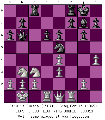 Last move : 0-1 2007 July 15 16:5:14 [Event "FICGS__CHESS__LIGHTNING_BRONZE__000013"] [Site "FICGS"] [Date "2007.07.15"] [Round "1"] [White "Cirulis,Ilmars"] [Black "Gray,Garvin"] [Result "0-1"] [WhiteElo "1507"] [BlackElo "1965"] 1.e4 c5 2.Nf3 d6 3.Nc3 Nf6 4.d4 cxd4 5.Nxd4 Nc6 6.Be3 Ng4 7.Bb5 Nxe3 8.fxe3 Bd7 9.Qf3 Ne5 10.Qg3 g6 11.O-O-O Bxb5 12.Ndxb5 a6 13.Nd4 Bg7 14.Rhf1 Rc8 15.Kb1 O-O 16.Qe1 e6 17.h4 Qa5 18.Nb3 Qb6 0-1 Sicilian Queenside Castling by player White (move 11) Kingside Castling by player Black (move 15) Player Black won this chess game. Follow this game move after move (download)Chess makes man wiser and clear-sighted. (Vladimir Putin) Es ist peinlich, dass ich nie Weltmeister wurde. Es wäre leicht, Leonid Breschnjew als Ursache vorzuschieben, dessen Apparat den Vorzeigekommunisten Anatoli Karpow in allem unterstützte. Aber Garri Kasparow zum Beispiel, der ebenfalls von den Sowjets unerwünscht war, hat trotz der Widerstände den WM-Titel erobert. (Viktor Kortschnoi) No todos los artistas son jugadores de Ajedrez, pero todos los jugadores de Ajedrez son artistas. (Marcel Duchamp) La victoire dans une partie d'Echecs appartient la plupart du temps à celui qui voit un peu plus loin que l'adversaire. (Lasker) Convictions are more dangerous enemies of truth than lies. (Friedrich Nietzsche)
