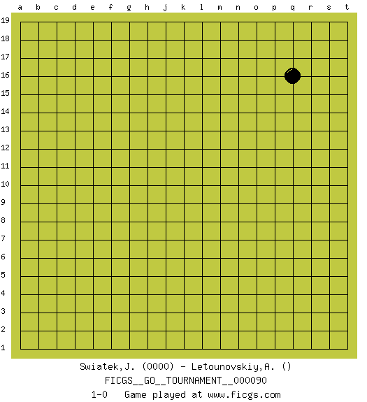 Last move : 1-0 2021 September 25 13:3:29 [Event "FICGS__GO__TOURNAMENT__000090"] [Site "FICGS"] [Date "2021.08.25"] [Round "1"] [Black "Swiatek,Janusz"] [White "Letounovskiy,Alexey"] [Result "1-0"] [Rating 1 "0000"] 1.q16 1-0 This go game has been lost on time (started : 2021.08.25 13:52:27) Here are the names of the openings (joseki) played in the four corners : Player Black won this Go (weiqi, baduk) game. Follow this game move after move (download)Don't reduce your own liberties. (Bill Taylor) Life is like a ten-speed bicycle: most of us have gears we never use. (Charles M. Schulz)