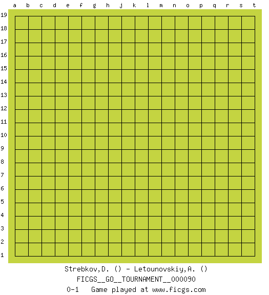 Last move : 0-1 2021 September 24 19:20:4 [Event "FICGS__GO__TOURNAMENT__000090"] [Site "FICGS"] [Date "2021.08.25"] [Round "1"] [Black "Strebkov,Dmytro"] [White "Letounovskiy,Alexey"] [Result "0-1"] 0-1 This go game has been lost on time (started : 2021.08.25 13:52:27) Here are the names of the openings (joseki) played in the four corners : Player White won this Go (weiqi, baduk) game. Follow this game move after move (download)Always remember, keep the balance. [between territory and influence] (Figaro) You lose, general Kenobi. (General Grievous in Star Wars ep.3)