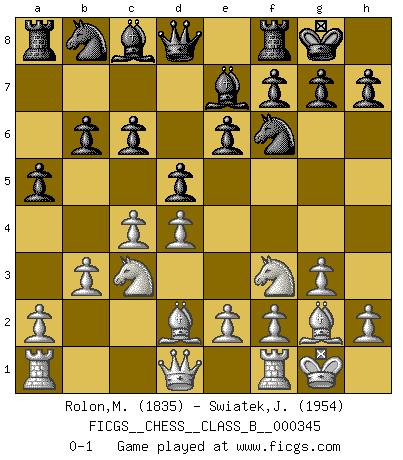 Last move : 0-1 2021 October 30 14:47:11 [Event "FICGS__CHESS__CLASS_B__000345"] [Site "FICGS"] [Date "2021.08.28"] [Round "1"] [White "Rolon,Maximiliano"] [Black "Swiatek,Janusz"] [Result "0-1"] [WhiteElo "1835"] [BlackElo "1954"] 1.d4 Nf6 2.c4 e6 3.g3 Bb4+ 4.Bd2 Be7 5.Bg2 d5 6.Nf3 O-O 7.O-O c6 8.b3 b6 9.Nc3 a5 0-1 This chess game has been lost on time (started : 2021.08.28 23:57:32) Catalan Opening Kingside Castling by player Black (move 6) Kingside Castling by player White (move 7) Player Black won this chess game. Follow this game move after move (download)I feel as if I were a piece in a game of Chess, when my opponent says of it: That piece cannot be moved. (Soren Kierkegaard) Schach ist das schnellste Spiel der Welt, weil man in jeder Sekunde Tausende von Gedanken ordnen muß. (Albert Einstein) a manera como él juega al Ajedrez, demuestra la completa naturaleza de un hombre. (Stanley Ellin) Assurément je connaissais par expérience le mystérieux attrait de ce jeu royal, le seul entre tous les jeux inventés par les hommes qui échappe souverainement à la tyrannie du hasard, le seul où l'on ne doive sa victoire qu'à son intelligence ou plutôt à une certaine forme d'intelligence. Mais n'est-ce pas déjà le limiter injurieusement que d'appeler les échecs un jeu ? N'est-ce pas une science, un art ou quelque chose qui, comme le cercueil de Mahomet entre ciel et terre, est suspendu entre l'un et l'autre, et qui réunit un nombre incroyable de contraires ? [...] C'est une pensée qui ne mène à rien, une mathématique qui n'établit rien, un art qui ne laisse pas d'uvre, une architecture sans matière; et il l'a prouvé néanmoins qu'il était plus durable, à sa manière, que les livres ou que tout autre monument, ce jeu unique qui appartient à tous les peuples et à tous les temps, et dont personne ne sait quel dieu en fit don à la terre pour tuer l'ennui, pour aiguiser l'esprit et stimuler l'âme. Où commence-t-il, où finit-il ? (Stefan Zweig) Perseverance does not equal worthiness. Next time you want to get my attention, wear something fun. Low-riding jeans are hot. (Gregory House, House M.D.)