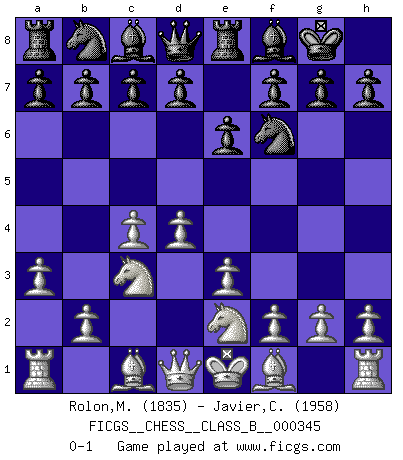 Last move : 0-1 2021 November 2 12:26:32 [Event "FICGS__CHESS__CLASS_B__000345"] [Site "FICGS"] [Date "2021.08.28"] [Round "1"] [White "Rolon,Maximiliano"] [Black "Javier,Christian"] [Result "0-1"] [WhiteElo "1835"] [BlackElo "1958"] 1.d4 Nf6 2.c4 e6 3.Nc3 Bb4 4.e3 O-O 5.Nge2 Re8 6.a3 Bf8 0-1 This chess game has been lost on time (started : 2021.08.28 23:57:32) Nimzo-Indian : 4.e3 O-O Kingside Castling by player Black (move 4) Player Black won this chess game. Follow this game move after move (download)Chess is above all, a fight ! (Emanuel Lasker) Es war undenkbar für die Behörden, dass ein sowjetischer Großmeister auf diese Art und Weise [Fischer-Taimanov 6:0] verliert, ohne dass es eine politischer Erklärung dafür gäbe. (Mark Taimanov) A la fecha, Fischer esta simplemente un nivel arriba de todos los mejores jugadores de Ajedrez del mundo. (John Jacobs) Même un GMI sait rarement calculer sur plus de cinq coups une attaque à sacrifices. (Rudolf Spielmann) Always two there are. No more no less. A master, and an apprentice. (Master Yoda in Star Wars ep.1)