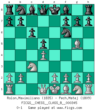 Last move : 0-1 2021 November 8 10:32:40 [Event "FICGS__CHESS__CLASS_B__000345"] [Site "FICGS"] [Date "2021.08.28"] [Round "1"] [White "Rolon,Maximiliano"] [Black "Pech,Matej"] [Result "0-1"] [WhiteElo "1835"] [BlackElo "1809"] 1.d4 d5 2.c4 e6 3.Nc3 Nf6 4.cxd5 exd5 5.Bg5 c6 0-1 This chess game has been lost on time (started : 2021.08.28 23:57:32) QGD : Exchange, positional line, 5...c6 Player Black won this chess game. Follow this game move after move (download)Chess makes man wiser and clear-sighted. (Vladimir Putin) Ich brauche nur einen Blick auf das Schachbrett zu werfen, und weiß schon, was in der Stellung steckt, was geschehen kann und was geschehen wird. Alle übrigen suchen und prüfen, ich aber weiß es! (José Raúl Capablanca) Una partida de Ajedrez se divide en 3 etapas: la primera cuando piensas que tienes la ventaja, la segunda cuando crees que tienes la ventaja y la tercera... ¡cuando te das cuenta que vas a perder!. (Savielly Tartakower) Même si l'adversaire joue le coup analysé précédemment, recommencez l'analyse en voyant la nouvelle position. Première règle de Blumenfeld Macintosh - we might not get everything right, but at least we knew the century was going to end. (Douglas Adams)