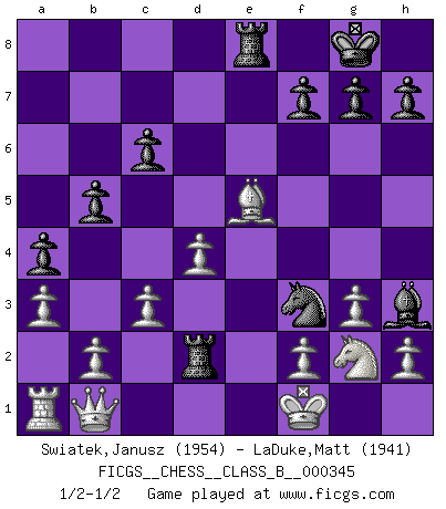 Last move : 1/2-1/2 2021 October 6 1:55:40 [Event "FICGS__CHESS__CLASS_B__000345"] [Site "FICGS"] [Date "2021.08.28"] [Round "1"] [White "Swiatek,Janusz"] [Black "LaDuke,Matt"] [Result "1/2-1/2"] [WhiteElo "1954"] [BlackElo "1941"] 1.e4 e5 2.Nf3 Nc6 3.Bb5 a6 4.Ba4 Nf6 5.O-O Be7 6.Re1 b5 7.Bb3 O-O 8.c3 d5 9.exd5 Nxd5 10.Nxe5 Nxe5 11.Rxe5 c6 12.d4 Bd6 13.Re1 Qh4 14.g3 Qh3 15.Qd3 Bf5 16.Qf1 Qh5 17.Be3 Rae8 18.Nd2 Bh3 19.Bd1 Qf5 20.Qe2 Re7 21.Nf3 Rfe8 22.Qc2 Qf6 23.Qd3 Bf5 24.Qd2 a5 25.Nh4 Bh3 26.Ng2 a4 27.a3 Nb6 28.Be2 Qe6 29.Bf4 Qxe2 30.Rxe2 Rxe2 31.Qc1 Nc4 32.Bxd6 Nd2 33.Be5 Nf3+ 34.Kf1 Rd2 35.Qb1 1/2-1/2 Ruy Lopez : Closed, 7...O-O Kingside Castling by player White (move 5) Kingside Castling by player Black (move 7) This chess game ended in a draw. Follow this game move after move (download)There are two types of sacrifices: correct ones and mine. (Mikhail Tal) Im Schach nämlich geht es darum, daß Ich des Gegners klein zu kriegen, sein Ego zu zerbrechen und zu zermahlen, seine Selbstachtung zu zertreten und zu verscharren und seine ganze mißachtenswerte sogenannte Persönlichkeit ein für alle Mal tot zu hacken und zu zerstampfen und dadurch die menschliche Gesellschaft von einer stinkenden Pestbeule zu befreien. Es ist ein königliches Spiel. (Robert James Fischer) ¿Porque tengo que perder ante este idiota?. (Aron Nimzovich) Les échecs sont plus proches de l'art de l'assassinat que de l'art de la guerre. (Arturo Perez-Reverte) Whoever said the pen is mightier than the sword obviously never encountered automatic weapons. (US General Douglas MacArthur)