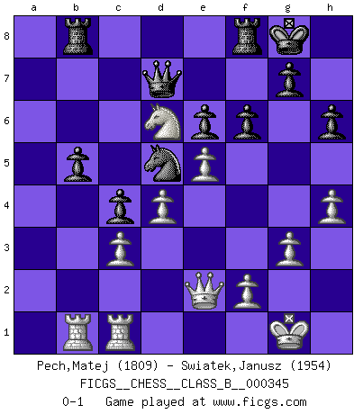 Last move : 0-1 2022 January 16 13:29:26 [Event "FICGS__CHESS__CLASS_B__000345"] [Site "FICGS"] [Date "2021.08.28"] [Round "1"] [White "Pech,Matej"] [Black "Swiatek,Janusz"] [Result "0-1"] [WhiteElo "1809"] [BlackElo "1954"] 1.d4 Nf6 2.c4 e6 3.Nc3 Bb4 4.e3 O-O 5.Bd3 d5 6.Nf3 dxc4 7.Bxc4 c5 8.O-O a6 9.a3 Bxc3 10.bxc3 b5 11.Be2 c4 12.Nd2 Bb7 13.Qc2 Nc6 14.e4 Na5 15.Rb1 Nb3 16.Bf3 Nxc1 17.Qxc1 Rb8 18.a4 Bc6 19.Re1 Qc7 20.axb5 axb5 21.e5 Nd5 22.Ne4 Ne7 23.Qe3 h6 24.Nd6 Bxf3 25.Qxf3 Qd7 26.Rec1 f6 27.Qe2 Nd5 28.g3 Qc6 29.h4 Qd7 0-1 Nimzo-Indian : 4.e3 O-O, 5.Bd3 d5 Kingside Castling by player Black (move 4) Kingside Castling by player White (move 8) Player Black won this chess game. Follow this game move after move (download)Daring ideas are like Chess men moved forward. They may be beaten, but they may start a winning game. (Johann Wolfgang von Goethe) Schach ist Krieg, im Schach geht es um testosterongesteuerte Urschreie. (Garry Kasparov) La vida es como un juego de Ajedrez, cambiando con cada movimiento. (Proverbio Chino) Je ne suis pas le dernier à jouer lâchement des coups douteux pendant le zeïtnot de l'adversaire pour l'achever: en effet les coups qui font le plus peur sont ceux que l'on ne comprend pas. Je me fais souvent peur quand je joue. (Un professeur anonyme) I believe in luck. How else can you explain the success of those you dislike ? (Jean Cocteau)