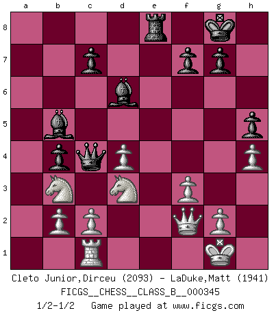 Last move : 1/2-1/2 2021 November 3 1:48:43 [Event "FICGS__CHESS__CLASS_B__000345"] [Site "FICGS"] [Date "2021.08.28"] [Round "1"] [White "Cleto Junior,Dirceu"] [Black "LaDuke,Matt"] [Result "1/2-1/2"] [WhiteElo "2093"] [BlackElo "1941"] 1.e4 e5 2.Nf3 Nc6 3.Bb5 a6 4.Ba4 Nf6 5.O-O Be7 6.Re1 b5 7.Bb3 O-O 8.h3 Bb7 9.d3 d5 10.exd5 Nxd5 11.a4 Nd4 12.Nbd2 Nxb3 13.Nxb3 Nb4 14.Nxe5 Qd5 15.f3 Bd6 16.d4 Rad8 17.Bd2 Rfe8 18.axb5 axb5 19.Bxb4 Bxb4 20.Re2 h5 21.Nd3 Bd6 22.Qd2 Rxe2 23.Qxe2 Bc6 24.Qf2 b4 25.Nbc5 Qc4 26.Nb3 Re8 27.h4 Bb5 28.Rc1 1/2-1/2 Ruy Lopez : Closed, 7...O-O Kingside Castling by player White (move 5) Kingside Castling by player Black (move 7) This chess game ended in a draw. Follow this game move after move (download)Chess is like war on a board. (Bobby Fischer) Ich kämpfe solange mein Gegner einen Fehler machen kann. (Emanuel Lasker) Puntos débiles o agujeros en la posición de tu oponente deben de ser ocupados por piezas, no Peones. (Siegbert Tarrasch) Si le désir cupide (et stupide) de gagner est une inépuisable source de souffrance, une combinaison brillante sur l'échiquier est une découverte : le coquelicot qui s'épanouit lorsque apparaît la Voie Lactée. (Arrabal) When a man with money meets a man with experience, the man with experience leaves with money and the man with money leaves with experience. (Anonymous)