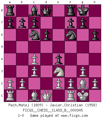 Last move : 1-0 2021 November 16 12:18:59 [Event "FICGS__CHESS__CLASS_B__000345"] [Site "FICGS"] [Date "2021.08.28"] [Round "1"] [White "Pech,Matej"] [Black "Javier,Christian"] [Result "1-0"] [WhiteElo "1809"] [BlackElo "1958"] 1.c4 e5 2.Nc3 Nf6 3.Nf3 Nc6 4.g3 Bb4 5.Bg2 O-O 6.O-O e4 7.Ne1 Bxc3 8.dxc3 h6 9.Nc2 d6 10.Ne3 1-0 This chess game has been lost on time (started : 2021.08.28 23:57:32) English Opening Kingside Castling by player Black (move 5) Kingside Castling by player White (move 6) Player White won this chess game. Follow this game move after move (download)The essence of Chess is thinking about what Chess is. (David Bronstein) Herr Iljumschinow ist ein etwas merkwürdiger Geschäftsmann: Er arbeitet zusammen mit Leuten wie Muammar al-Gaddafi; früher ist das Saddam Hussein gewesen. (Joel Lautier) Uno no tiene que jugar muy bien, es suficiente jugar mejor que el oponente. (Siegbert Tarrasch) Roi des jeux et jeu des rois, les échecs portent en eux un sentiment d'infini. Ils donnent à celui qui s'est efforcé d'en approfondir les arcanes l'impression de n'être pas à la mesure de l'homme; en fait, ils constituent un résumé de l'univers, un microcosme, et figurent cette grande échelle qui, dans les plans de la lumière descend jusqu'à la matière, qui des abîmes insondables remonte jusqu'en l'infini de Dieu. (Pyrame) If you are going through hell, keep going. (Winston Churchill)