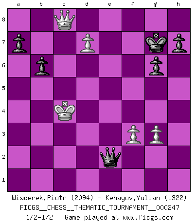 Last move : 1/2-1/2 2022 January 17 5:49:16 [Event "FICGS__CHESS__THEMATIC_TOURNAMENT__000247"] [Site "FICGS"] [Date "2021.08.29"] [Round "1"] [White "Wiaderek,Piotr"] [Black "Kehayov,Yulian"] [Result "1/2-1/2"] [WhiteElo "2094"] [BlackElo "1322"] 1.d4 Nf6 2.c4 e6 3.Nf3 b6 4.a3 Bb7 5.Nc3 d5 6.cxd5 Nxd5 7.e3 Nxc3 8.bxc3 Be7 9.Bd3 O-O 10.O-O c5 11.Qe2 Nc6 12.Bb2 Qc7 13.e4 Na5 14.Rad1 g6 15.h4 Qf4 16.Bc1 Qg4 17.Bh6 Rfd8 18.Qe3 f6 19.Rfe1 Rac8 20.Nh2 Qxh4 21.g3 cxd4 22.cxd4 Qh5 23.Be2 Nc4 24.Qb3 Qxh6 25.Bxc4 Rc7 26.Bxe6+ Kh8 27.d5 Qf8 28.Kg2 Bxa3 29.Ng4 Bc8 30.e5 Bxe6 31.dxe6 Rxd1 32.Rxd1 Be7 33.exf6 Bxf6 34.Nxf6 Qxf6 35.Rd7 Rxd7 36.exd7 Kg7 37.Qc4 Qd6 38.Qc8 Qd5+ 39.f3 Qd2+ 40.Kh3 Qh6+ 41.Kg2 Qd2+ 42.Kh3 Qh6+ 43.Kg4 Qh5+ 44.Kf4 Qf5+ 45.Ke3 Qe6+ 46.Kd3 Qd5+ 47.Kc3 Qe5+ 48.Kd2 Qd4+ 49.Kc2 Qa4+ 50.Kd3 Qd1+ 51.Kc4 Qe2+ 1/2-1/2 Queen's Indian : Petrosian system Kingside Castling by player Black (move 9) Kingside Castling by player White (move 10) This chess game ended in a draw. Follow this game move after move (download)Weak points or holes in the opponent's position must be occupied by pieces not Pawns. (Siegbert Tarrasch) Jeder weiß, dass Gasprom Putins persönliches Machtinstrument ist. Die Firma wird vom Kreml aus geleitet und wird schon deshalb nie transparent sein. (Garry Kasparov) Solo puedes ser bueno en el Ajedrez si amas al juego. (Bobby Fischer) La conception d'un plan est le processus par lequel un joueur exploite les avantages de sa position tout en s'efforçant d'en réduire au minimum les inconvénients. Afin de garantir le succès, un plan doit toujours se fonder sur un diagnostic objectif des particularités d'une position. La conception d'un plan est d'autant plus difficile que la position est équilibrée, et grandement facilitée lorsqu'il n'existe qu'un seul plan susceptible de répondre aux exigences de la position. (Harry Golombek) In God we trust, all others we virus scan. (Anonymous)