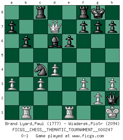 Last move : 0-1 2021 September 12 5:35:31 [Event "FICGS__CHESS__THEMATIC_TOURNAMENT__000247"] [Site "FICGS"] [Date "2021.08.29"] [Round "1"] [White "Brand Lyard,Paul"] [Black "Wiaderek,Piotr"] [Result "0-1"] [WhiteElo "1777"] [BlackElo "2094"] 1.d4 Nf6 2.c4 e6 3.Nf3 b6 4.a3 Bb7 5.Nc3 d5 6.cxd5 Nxd5 7.e4 Nxc3 8.bxc3 Bxe4 9.Ne5 Qh4 10.Bb5+ c6 11.Nxc6 Bxc6 12.Bxc6+ Nxc6 13.O-O Bd6 14.h3 Rc8 15.Qa4 O-O 16.Rb1 Qe4 17.Be3 Na5 18.Qd7 Nc4 19.f3 Qxe3+ 20.Kh1 Qf4 21.Rfe1 Qh2+ 0-1 Queen's Indian : Petrosian system Kingside Castling by player White (move 13) Kingside Castling by player Black (move 15) Player Black won this chess game. Follow this game move after move (download)I won't play with you anymore. You have insulted my friend. - When an opponent cursed himself for a blunder. (Miguel Najdorf) Nach Morphy wurde nichts neues mehr in der Behandlung offener Positionen gefunden. (Mikhail Moiseyevich Botvinik) Si el Ajedrez es una ciencia, es la mas inexacta. Si el Ajedrez es un arte, es demasiado inexacto para ser visto como tal. Si el Ajedrez es un deporte, es demasiado esotérico. Si el Ajedrez es un juego, es demasiado exigente para ser solo un juego. Si el Ajedrez es una aventura, es una muy demandante. Si el Ajedrez es una pasión, es una muy gratificante. Si el Ajedrez es la vida, es una muy triste. (Anónimo) Vous m'avez demandé de vous exposer quel est le fondement de la prière. Je ne fais que préparer les pièces du jeu sur la table... Nous sera-t-il permis d'en adopter les règles et si nous les appliquons scrupuleusement nous ne tarderons pas à faire mat le Roi divin ! Il ne pourra échapper à nos mains. (Sainte Thérèse d'Avila, Chemin de perfection) Indecision is the key to flexibility. (Unknown)