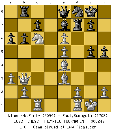 Last move : 1-0 2021 September 17 16:6:8 [Event "FICGS__CHESS__THEMATIC_TOURNAMENT__000247"] [Site "FICGS"] [Date "2021.08.29"] [Round "1"] [White "Wiaderek,Piotr"] [Black "Paul,Samagata"] [Result "1-0"] [WhiteElo "2094"] [BlackElo "1703"] 1.d4 Nf6 2.c4 e6 3.Nf3 b6 4.a3 Bb7 5.Nc3 d5 6.cxd5 Nxd5 7.e3 Bd6 8.Bd3 O-O 9.e4 Nf4 10.Bf1 Nd7 11.e5 Nxg2+ 12.Bxg2 Be7 13.O-O f6 14.Ng5 fxg5 15.Bxb7 Rb8 16.Bc6 Rf5 17.Be3 Nf8 18.Rc1 Ng6 19.Qb3 Nf8 20.Nb5 a6 21.Na7 h5 22.Be4 Rf7 23.Nc6 Qc8 24.d5 Qe8 25.dxe6 1-0 Queen's Indian : Petrosian system Kingside Castling by player Black (move 8) Kingside Castling by player White (move 13) Player White won this chess game. Follow this game move after move (download)Chess is a terrific way for kids to build self image and self esteem. (Saudin Robovic) Stelle das Brett so, daß die Sonne in die Augen deines Gegners scheint. (Ruy López) Yo siempre he tenido un ligero sentimiento de lástima por una persona que no tiene conocimiento del Ajedrez. (Siegbert Tarrasch) Aux échecs, les retours au sommet sont rares : les dommages psychologiques consécutifs à une défaite sont trop sévères. (Daily Telegraph) Memory is a crazy woman that hoards colored rags and throws away food. (Austin O'Malley)