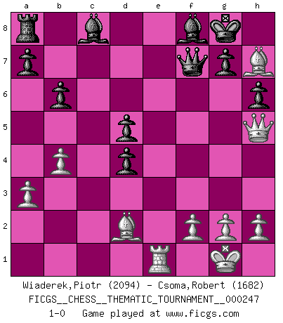 Last move : 1-0 2021 October 12 21:44:10 [Event "FICGS__CHESS__THEMATIC_TOURNAMENT__000247"] [Site "FICGS"] [Date "2021.08.29"] [Round "1"] [White "Wiaderek,Piotr"] [Black "Csoma,Robert"] [Result "1-0"] [WhiteElo "2094"] [BlackElo "1682"] 1.d4 Nf6 2.c4 e6 3.Nf3 b6 4.a3 Bb7 5.Nc3 d5 6.cxd5 Nxd5 7.e3 Be7 8.Qa4+ Bc6 9.Qc2 O-O 10.Bd2 Nd7 11.Bd3 h6 12.O-O N5f6 13.e4 Bb7 14.e5 Nd5 15.Bh7+ Kh8 16.Be4 c5 17.Nxd5 exd5 18.Bd3 cxd4 19.b4 Re8 20.Rae1 Bf8 21.Qd1 Nxe5 22.Nxe5 Kg8 23.Qg4 Bc8 24.Qh5 Qf6 25.Nxf7 Rxe1 26.Rxe1 Qxf7 27.Bh7+ 1-0 Queen's Indian : Petrosian system Kingside Castling by player Black (move 9) Kingside Castling by player White (move 12) Player White won this chess game. Follow this game move after move (download)Fischer is completely natural. He plays no roles. He's like a child. Very, very simple. (Zita Rajcsanyi) Schach ist eine Sache der genauen Beurteilung, wann man zuschlagen und wann man sich ducken muss. (Robert James Fischer) Robert Fischer es la ley hacia si mismo. (Larry Evans) Karpov est une pièce de musée. (Garry Kasparov) Rules and bones are meant to be broken. (Anonymous)